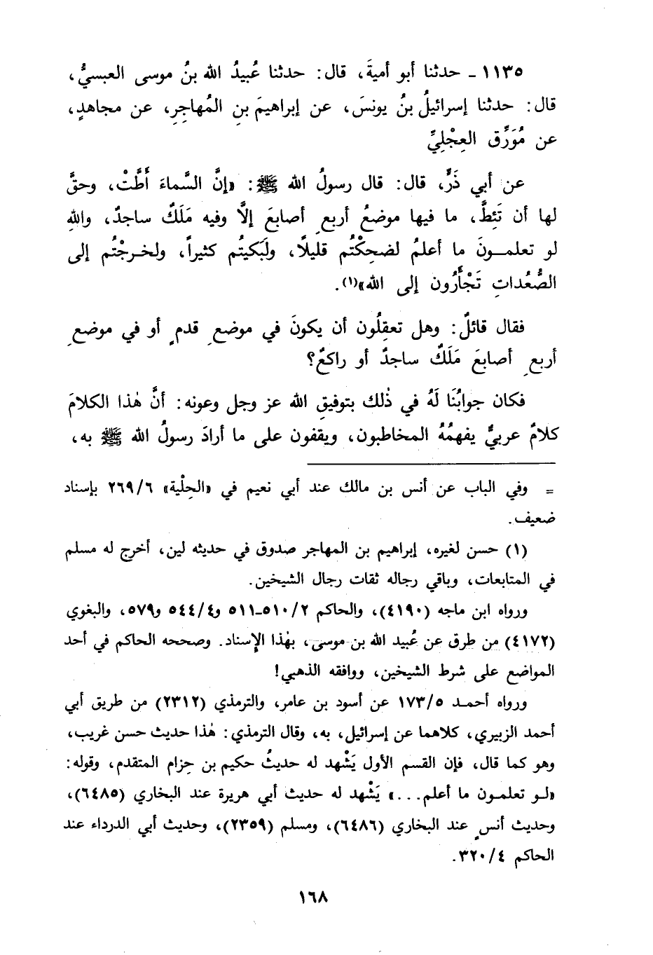 1135 - حَدَّثَنَا أَبُو أُمَيَّةَ، قَالَ: حَدَّثَنَا عُبَيْدُ اللهِ بْنُ مُوسَى الْعَبْسِيُّ، قَالَ: حَدَّثَنَا إسْرَائِيلُ بْنُ يُونُسَ، عَنْ إِبْرَاهِيمَ بْنِ الْمُهَاجِرِ، عَنْ مُجَاهِدٍ، عَنْ مُوَرِّقٍ الْعِجْلِيِّ، عَنْ أَبِي ذَرٍّ، قَالَ: قَالَ رَسُولُ اللهِ صَلَّى اللَّهُ عَلَيْهِ وَسَلَّمَ: " إِنَّ السَّمَاءَ أَطَّتْ وَحُقَّ لَهَا أَنْ تَئِطَّ مَا فِيهَا مَوْضِعُ أَرْبَعِ أَصَابِعَ إِلَّا وَفِيهِ مَلَكٌ سَاجِدٌ , وَاللهِ لَوْ تَعْلَمُونَ مَا أَعْلَمُ لَضَحِكْتُمْ قَلِيلًا وَلَبَكَيْتُمْ كَثِيرًا وَلَخَرَجْتُمْ إِلَى الصُّعُدَاتِ تَجْأَرُونَ إِلَى اللهِ " فَقَالَ قَائِلٌ: وَهَلْ تَعْقِلُونَ أَنْ يَكُونَ فِي مَوْضِعِ قَدَمٍ أَوْ فِي مَوْضِعِ أَرْبَعِ أَصَابِعَ مَلَكٌ سَاجِدٌ أَوْ رَاكِعٌ؟ فَكَانَ جَوَابُنَا لَهُ فِي ذَلِكَ بِتَوْفِيقِ اللهِ عَزَّ وَجَلَّ وَعَوْنِهِ: أَنَّ هَذَا الْكَلَامَ كَلَامٌ عَرَبِيٌّ يَفْهَمُهُ الْمُخَاطَبُونَ , وَيَقِفُونَ عَلَى مَا أَرَادَ رَسُولُ اللهِ صَلَّى اللَّهُ عَلَيْهِ وَسَلَّمَ بِهِ -[169]- وَالْعَرَبُ تُطْلِقُ أَنْ يُقَالَ: فُلَانٌ جَالِسٌ عَلَى كَذَا لِمَا نَقَصَ عَنْهُ وَفُلَانٌ جَالِسٌ عَلَى كَذَا لِمَا يَفْضُلُ عَنْهُ , وَذَلِكَ مَوْجُودٌ فِي كَلَامِ النَّاسِ، يَقُولُونَ: فُلَانٌ جَالِسٌ عَلَى الْحَصِيرِ وَهِيَ مُقَصِّرَةٌ عَنْهُ، وَجُلُوسُهُ فِي الْحَقِيقَةِ عَلَيْهَا وَعَلَى غَيْرِهَا مِنَ الْأَرْضِ وَمِمَّا سِوَاهَا , وَيَقُولُونَ: فُلَانٌ جَالِسٌ عَلَى الْحَصِيرِ الْفَاضِلَةِ عَنْهُ، وَكَانَتْ حَقِيقَةُ ذَلِكَ أَنَّ جُلُوسَهُ عَلَى بَعْضِهَا لَا عَلَى كُلِّهَا , وَلَمَّا كَانَ ذَلِكَ كَذَلِكَ كَانَ مِثْلَهُ قَوْلُ رَسُولِ اللهِ صَلَّى اللَّهُ عَلَيْهِ وَسَلَّمَ فِي هَذَيْنِ الْحَدِيثَيْنِ " مَا مِنْهَا مَوْضِعُ قَدَمٍ " أَوْ " مَا مِنْهَا مَوْضِعُ أَرْبَعِ أَصَابِعَ إِلَّا وَعَلَيْهَا مَلَكٌ، إمَّا سَاجِدٌ وَإِمَّا رَاكِعٌ " عَلَى مَعْنًى إِلَّا: وَفِيهِ مَلَكٌ سَاجِدٌ، أَوْ: إِلَّا وَعَلَيْهِ مَلَكٌ رَاكِعٌ أَوْ سَاجِدٌ، عَلَى أَنَّ كَوْنَهُ عَلَيْهِ فِي الْحَقِيقَةِ كَوْنٌ عَلَيْهِ وَعَلَى غَيْرِهِ كَمَا كَانَ الْجُلُوسُ عَلَى الْحَصِيرِ الْمُقَصِّرَةِ عَلَى الْجَالِسِ عَلَيْهَا جُلُوسًا عَلَيْهَا وَعَلَى مَا سِوَاهَا، وَاللهَ نَسْأَلُهُ التَّوْفِيقَ