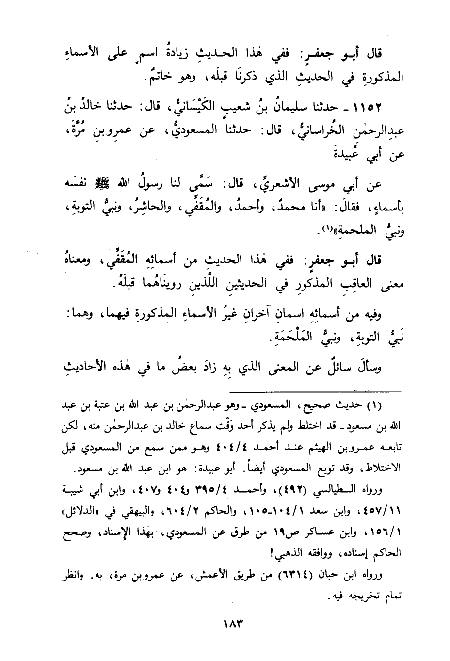 1152 - حَدَّثَنَا سُلَيْمَانُ بْنُ شُعَيْبٍ الْكَيْسَانِيُّ، قَالَ: حَدَّثَنَا خَالِدُ بْنُ عَبْدِ الرَّحْمَنِ الْخُرَاسَانِيُّ، قَالَ: حَدَّثَنَا الْمَسْعُودِيُّ، عَنْ عَمْرِو بْنِ مُرَّةَ، عَنْ أَبِي عُبَيْدَةَ، عَنْ أَبِي مُوسَى الْأَشْعَرِيِّ، قَالَ: سَمَّى لَنَا رَسُولُ اللهِ صَلَّى اللَّهُ عَلَيْهِ وَسَلَّمَ نَفْسَهُ بِأَسْمَاءٍ فَقَالَ: " أَنَا مُحَمَّدٌ وَأَحْمَدُ وَالْمُقَفِّي وَالْحَاشِرُ وَنَبِيُّ التَّوْبَةِ وَنَبِيُّ الْمَلْحَمَةِ " قَالَ أَبُو جَعْفَرٍ: فَفِي هَذَا الْحَدِيثِ مِنْ أَسْمَائِهِ الْمُقَفِّي، وَمَعْنَاهُ مَعْنَى الْعَاقِبِ الْمَذْكُورِ فِي الْحَدِيثَيْنِ اللَّذَيْنِ رَوَيْنَاهُمَا قَبْلَهُ، وَفِيهِ مِنْ أَسْمَائِهِ اسْمَانِ آخَرَانِ غَيْرُ الْأَسْمَاءِ الْمَذْكُورَةِ فِيهِمَا، وَهُمَا نَبِيُّ التَّوْبَةِ وَنَبِيُّ الْمَلْحَمَةِ، وَسَأَلَ سَائِلٌ عَنِ الْمَعْنَى الَّذِي بِهِ زَادَ بَعْضُ مَا فِي هَذِهِ الْأَحَادِيثِ -[184]- عَلَى مَا سِوَاهُ مِنْهَا؟ فَكَانَ جَوَابُنَا لَهُ فِي ذَلِكَ بِتَوْفِيقِ اللهِ وَعَوْنِهِ أَنَّ الْأَسْمَاءَ إِنَّمَا هِيَ أَعْلَامٌ لِأَشْيَاءَ يُرَادُ بِهَا التَّفْرِيقُ بَيْنَهَا وَإِبَانَةُ بَعْضِهَا مِنْ بَعْضٍ , وَكَانَتِ الْأَسْمَاءُ تَنْقَسِمُ قِسْمَيْنِ: فَقِسْمٌ مِنْهَا تَكُونُ الْأَسْمَاءُ فِيهِ لَا لِعِلَّةٍ، كَالْحَجَرِ وَكَالْجَبَلِ , وَكَمَا سِوَى ذَلِكَ مِمَّا لَمْ يُسَمَّ بِمَعْنًى فِيهِ وَمِنْهَا مَا يُسَمَّى بِهِ لِمَعْنًى فِيهِ مِنْ صِفَاتِهِ: كَمُحَمَّدٍ صَلَّى اللَّهُ عَلَيْهِ وَسَلَّمَ مِنَ الْحَمْدِ، وَكَأَحْمَدَ مِنَ الْحَمْدِ أَيْضًا، فَكَانَ هَذَانِ الِاسْمَانِ مِنْ أَسْمَائِهِ صَلَّى اللَّهُ عَلَيْهِ وَسَلَّمَ وَهُمَا اسْمَانِ قَدْ ذَكَرَهُمَا اللهُ جَلَّ وَعَزَّ فِي كِتَابِهِ فَقَالَ: {مُحَمَّدٌ رَسُولُ اللهِ وَالَّذِينَ مَعَهُ أَشِدَّاءُ عَلَى الْكُفَّارِ} [الفتح: 29] ، وَقَالَ تَعَالَى فِيمَا كَانَ عِيسَى ابْنُ مَرْيَمَ صَلَّى اللَّهُ عَلَيْهِ وَسَلَّمَ خَاطَبَ بِهِ قَوْمَهُ: {إِنِّي رَسُولُ اللهِ إلَيْكُمْ مُصَدِّقًا لِمَا بَيْنَ يَدَيَّ مِنَ التَّوْرَاةِ وَمُبَشِّرًا بِرَسُولٍ يَأْتِي مِنْ بَعْدِي اسْمُهُ أَحْمَدُ} [الصف: 6] ، فَكَانَ هَذَانِ الِاسْمَانِ مِنْ صِفَاتِهِ صَلَّى اللَّهُ عَلَيْهِ وَسَلَّمَ، فَوَقَفْنَا بِذَلِكَ عَلَى أَنَّهُ جَائِزٌ أَنْ يُسَمَّى بِصِفَاتِهِ سِوَى الْحَمْدِ كَمَا سُمِّيَ بِالْحَمْدِ الَّذِي هُوَ مِنْ صِفَاتِهِ، فَسُمِّيَ الْمَاحِيَ ; لِأَنَّ اللهَ عَزَّ وَجَلَّ يَمْحُو بِهِ الْكُفْرَ , وَسُمِّيَ الْحَاشِرَ ; لِأَنَّ النَّاسَ يُحْشَرُونَ عَلَى قَدَمِهِ , وَسُمِّيَ الْعَاقِبَ ; لِأَنَّهُ أَعْقَبَ مَنْ قَبْلَهُ مِنَ الْأَنْبِيَاءِ صَلَوَاتُ اللهِ عَلَيْهِمْ وَسُمِّيَ خَاتَمًا ; لِأَنَّهُ خَاتَمُ النَّبِيِّينَ وَذَكَرَ اللهُ عَزَّ وَجَلَّ ذَلِكَ فِي كِتَابِهِ فَقَالَ: {مَا كَانَ مُحَمَّدٌ أَبَا أَحَدٍ مِنْ رِجَالِكُمْ وَلَكِنْ رَسُولَ اللهِ وَخَاتَمَ النَّبِيِّينَ} [الأحزاب: 40] , وَسُمِّيَ الْمُقَفِّيَ ; لِأَنَّهُ قَفَّى مَنْ قَبْلَهُ مِنَ الْأَنْبِيَاءِ , وَسُمِّيَ نَبِيَّ التَّوْبَةِ ; لِأَنَّ اللهَ عَزَّ وَجَلَّ تَابَ بِهِ عَلَى مَنْ تَابَ مِنْ عِبَادِهِ , وَذَكَرَ ذَلِكَ فِي كِتَابِهِ مِنْ قَوْلِهِ عَزَّ وَجَلَّ: {لَقَدْ تَابَ اللهُ عَلَى النَّبِيِّ وَالْمُهَاجِرِينَ وَالْأَنْصَارِ الَّذِينَ اتَّبَعُوهُ فِي سَاعَةِ الْعُسْرَةِ مِنْ بَعْدِ مَا كَادَ يَزِيغُ قُلُوبُ فَرِيقٍ مِنْهُمْ ثُمَّ تَابَ عَلَيْهِمْ} [التوبة: 117] ، -[185]- وَسُمِّيَ نَبِيَّ الْمَلْحَمَةِ ; لِأَنَّهُ سَبَبُ الْقِتَالِ هُوَ الْمَلْحَمَةُ. وَكُلُّ هَذِهِ الْأَسْمَاءِ مُشْتَقَّةٌ مِنْ صِفَاتِهِ صَل