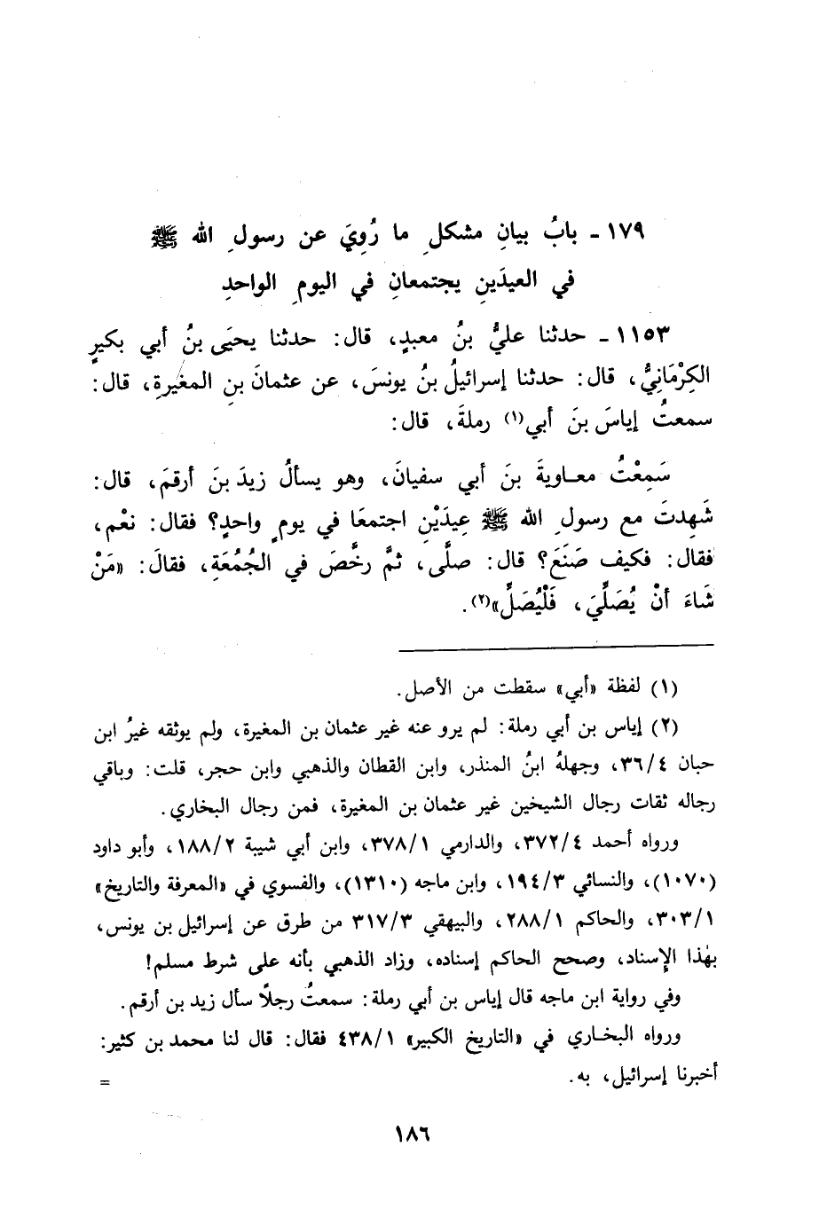 1153 - حَدَّثَنَا عَلِيُّ بْنُ مَعْبَدٍ، قَالَ: حَدَّثَنَا يَحْيَى بْنُ أَبِي بُكَيْرٍ الْكَرْمَانِيُّ، قَالَ: حَدَّثَنَا إسْرَائِيلُ بْنُ يُونُسَ، عَنْ عُثْمَانَ بْنِ الْمُغِيرَةِ، قَالَ: سَمِعْتُ إيَاسَ بْنَ أَبِي رَمْلَةَ، قَالَ: سَمِعْتُ مُعَاوِيَةَ بْنَ أَبِي سُفْيَانَ، , وَهُوَ يَسْأَلُ زَيْدَ بْنَ أَرْقَمَ قَالَ: شَهِدْتَ مَعَ رَسُولِ اللهِ صَلَّى اللَّهُ عَلَيْهِ وَسَلَّمَ عِيدَيْنِ اجْتَمَعَا فِي يَوْمٍ وَاحِدٍ؟ فَقَالَ: نَعَمْ، فَقَالَ فَكَيْفَ صَنَعَ؟ قَالَ: صَلَّى ثُمَّ رَخَّصَ فِي الْجُمُعَةِ فَقَالَ: " مَنْ شَاءَ أَنْ يُصَلِّيَ فَلْيُصَلِّ " -[187]- قَالَ أَبُو جَعْفَرٍ: وَعُثْمَانُ هَذَا هُوَ ابْنُ عَمِّ الْحَجَّاجِ بْنِ يُوسُفَ