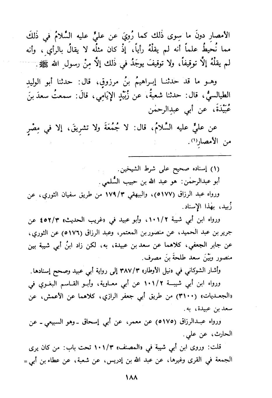 وَهُوَ مَا قَدْ حَدَّثَنَا إِبْرَاهِيمُ بْنُ مَرْزُوقٍ قَالَ: حَدَّثَنَا أَبُو الْوَلِيدِ الطَّيَالِسِيُّ قَالَ: حَدَّثَنَا شُعْبَةُ عَنْ زُبَيْدٍ الْإِيَامِيِّ قَالَ: سَمِعْتُ سَعْدَ بْنَ عُبَيْدَةَ، عَنْ أَبِي عَبْدِ الرَّحْمَنِ عَنْ عَلِيٍّ عَلَيْهِ السَّلَامُ قَالَ: " لَا جُمُعَةَ وَلَا تَشْرِيقَ إِلَّا فِي مِصْرٍ مِنَ الْأَمْصَارِ "