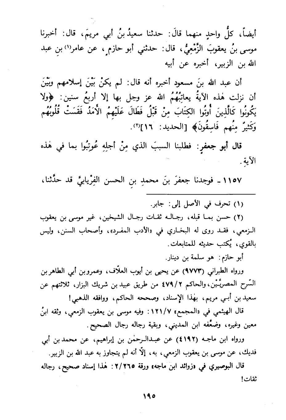 1157 - فَوَجَدْنَا جَعْفَرَ بْنَ مُحَمَّدِ بْنِ الْحَسَنِ الْفِرْيَابِيَّ قَدْ حَدَّثَنَا -[196]- قَالَ: حَدَّثَنَا إِسْحَاقُ بْنُ رَاهَوَيْهِ، قَالَ: حَدَّثَنَا عَمْرُو بْنُ مُحَمَّدٍ الْقُرَشِيُّ، قَالَ: حَدَّثَنَا خَلَّادٌ الصَّفَّارُ، عَنْ عَمْرِو بْنِ قَيْسٍ الْمُلَائِيِّ، عَنْ عَمْرِو بْنِ مُرَّةَ، عَنْ مُصْعَبِ بْنِ سَعْدٍ، عَنْ سَعْدٍ، فِي قَوْلِ اللهِ جَلَّ وَعَزَّ: {نَحْنُ نَقُصُّ عَلَيْكَ أَحْسَنَ الْقَصَصِ بِمَا أَوْحَيْنَا إلَيْكَ هَذَا الْقُرْآنَ} [يوسف: 3] الْآيَةَ، قَالَ: " أَنْزَلَ اللهُ عَلَى رَسُولِهِ فَتَلَاهُ عَلَيْهِمْ زَمَانًا فَقَالُوا: يَا رَسُولَ اللهِ لَوْ قَصَصْتَ عَلَيْنَا فَأَنْزَلَ اللهُ جَلَّ وَعَزَّ: {نَحْنُ نَقُصُّ عَلَيْكَ أَحْسَنَ الْقَصَصِ} [يوسف: 3] الْآيَةَ , قَالَ: فَتَلَاهُ عَلَيْهِمْ رَسُولُ اللهِ صَلَّى اللَّهُ عَلَيْهِ وَسَلَّمَ فَقَالُوا: يَا رَسُولَ اللهِ لَوْ حَدَّثْتَنَا، فَأَنْزَلَ اللهُ: {اللهُ نَزَّلَ أَحْسَنَ الْحَدِيثِ كِتَابًا مُتَشَابِهًا مَثَانِيَ} [الزمر: 23] قَالَ: كُلُّ ذَلِكَ يُؤْمَرُونَ بِالْقُرْآنِ، قَالَ خَلَّادٌ: وَزَادَ فِيهِ آخَرُ، قَالَ: قَالُوا: يَا رَسُولَ اللهِ: لَوْ ذَكَّرْتَنَا، فَأَنْزَلَ اللهُ عَزَّ وَجَلَّ: {أَلَمْ يَأْنِ لِلَّذِينَ آمَنُوا أَنْ تَخْشَعَ قُلُوبُهُمْ لِذِكْرِ اللهِ} [الحديد: 16] " -[197]- قَالَ أَبُو جَعْفَرٍ: فَكَانَ فِي هَذَا الْحَدِيثِ سُؤَالُهُمْ رَسُولَ اللهِ صَلَّى اللَّهُ عَلَيْهِ وَسَلَّمَ الْقَصَصَ عَلَيْهِمْ، أَيْ: لِتَلِينَ بِذَلِكَ قُلُوبُهُمْ فَأَنْزَلَ اللهُ عَزَّ وَجَلَّ عَلَيْهِ: {نَحْنُ نَقُصُّ عَلَيْكَ أَحْسَنَ الْقَصَصِ} [يوسف: 3] فَأَعْلَمَهُمْ عَزَّ وَجَلَّ أَنَّهُ لَا حَاجَةَ بِهِمْ إِلَى الْقَصَصِ مَعَ الْقُرْآنِ ; لِأَنَّهُ لَا يَقُصُّ عَلَيْهِمْ أَنْفَعَ لَهُمْ مِنْهُ , ثُمَّ سَأَلُوا أَنْ يُحَدِّثَهُمْ، فَأَنْزَلَ اللهُ عَزَّ وَجَلَّ عَلَيْهِ فِي ذَلِكَ مَا أَنْزَلَ عَلَيْهِ مِنْ أَجْلِهِ مِمَّا ذُكِرَ فِي هَذَا الْحَدِيثِ , وَكُلُّ ذَلِكَ يَرُدُّهُمْ إِلَى الْقُرْآنِ ; لِأَنَّهُمْ لَا يَرْجِعُونَ إِلَى شَيْءٍ يَجِدُونَ فِيهِ الَّذِي يَجِدُونَ فِي الْقُرْآنِ. وَبِاللهَ التَّوْفِيقُ