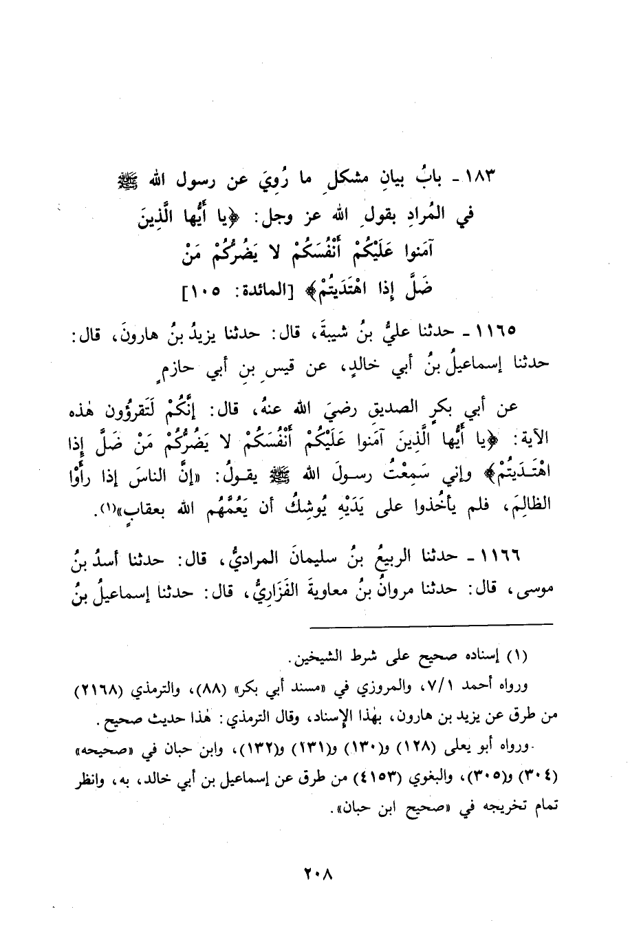1166 - حَدَّثَنَا الرَّبِيعُ بْنُ سُلَيْمَانَ الْمُرَادِيُّ، قَالَ: حَدَّثَنَا أَسَدُ بْنُ مُوسَى، قَالَ: حَدَّثَنَا مَرْوَانُ بْنُ مُعَاوِيَةَ الْفَزَارِيُّ، قَالَ: حَدَّثَنَا إِسْمَاعِيلُ بْنُ -[209]- أَبِي خَالِدٍ، عَنْ قَيْسِ بْنِ أَبِي حَازِمٍ، أَنَّ أَبَا بَكْرٍ الصِّدِّيقَ، رَضِيَ اللهُ عَنْهُ قَامَ عَلَى الْمِنْبَرِ فَقَالَ: يَا أَيُّهَا النَّاسُ إِنَّكُمْ تَقْرَءُونَ هَذِهِ الْآيَةَ ثُمَّ ذَكَرَ مِثْلَهُ. قَالَ أَبُو جَعْفَرٍ: فَكَانَ الَّذِي فِي هَذَيْنِ الْحَدِيثَيْنِ مِمَّا خَاطَبَ بِهِ أَبُو بَكْرٍ رَضِيَ اللهُ عَنْهُ النَّاسَ فِيهِمَا أَنَّهُمْ يَقْرَءُونَ هَذِهِ الْآيَةَ كَمَا تَلَاهَا عَلَيْهِمْ , وَأَنَّهُ سَمِعَ النَّبِيَّ صَلَّى اللَّهُ عَلَيْهِ وَسَلَّمَ يَقُولُ، فَذَكَرَ لَهُمْ مَا سَمِعَهُ قَالَهُ مِنْ هَذَيْنِ الْحَدِيثَيْنِ، وَنَحْنُ نَعْلَمُ أَنَّهُ رَضِيَ اللهُ عَنْهُ مَعَ حِكْمَتِهِ وَجَلَالَتِهِ وَعِظَمِ مِقْدَارِهِ لَا يُخَاطِبُ النَّاسَ بِخِطَابٍ فِيهِ نُقْصَانٌ , وَنَعْلَمُ أَنَّ مَا وَقَعَ مِنْ نُقْصَانٍ فِي ذَلِكَ فَمِنْ بَعْضِ رُوَاةِ هَذَا الْحَدِيثِ لَا مِنْهُ، ثُمَّ الْتَمَسْنَا مِنْ غَيْرِ هَاتَيْنِ الرِّوَايَتَيْنِ