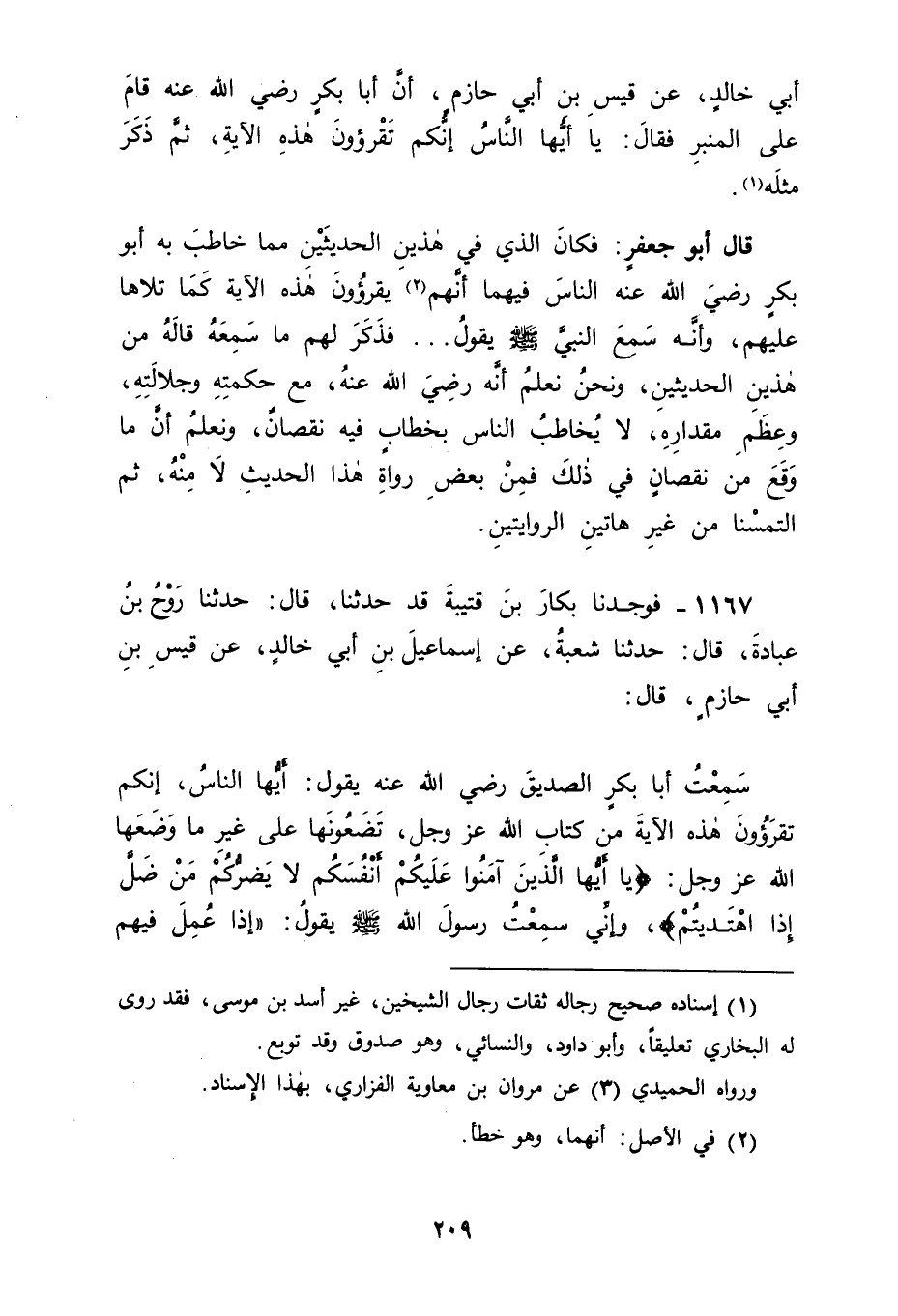 1167 - فَوَجَدْنَا بَكَّارَ بْنَ قُتَيْبَةَ قَدْ حَدَّثَنَا قَالَ: حَدَّثَنَا رَوْحُ بْنُ عُبَادَةَ، قَالَ: حَدَّثَنَا شُعْبَةُ، عَنْ إِسْمَاعِيلَ بْنِ أَبِي خَالِدٍ، عَنْ قَيْسِ بْنِ أَبِي حَازِمٍ، قَالَ: سَمِعْتُ أَبَا بَكْرٍ الصِّدِّيقَ، رَضِيَ اللهُ عَنْهُ يَقُولُ: أَيُّهَا النَّاسُ، إِنَّكُمْ تَقْرَءُونَ هَذِهِ الْآيَةَ مِنْ كِتَابِ اللهِ عَزَّ وَجَلَّ تَضَعُونَهَا عَلَى غَيْرِ مَا وَضَعَهَا اللهُ عَزَّ وَجَلَّ: {يَا أَيُّهَا الَّذِينَ آمَنُوا عَلَيْكُمْ أَنْفُسَكُمْ لَا يَضُرُّكُمْ مَنْ ضَلَّ إِذَا اهْتَدَيْتُمْ} [المائدة: 105] وَإِنِّي سَمِعْتُ رَسُولَ اللهِ صَلَّى اللَّهُ عَلَيْهِ وَسَلَّمَ يَقُولُ: " إِذَا عُمِلَ فِيهِمْ -[210]- بِالْمَعَاصِي أَوْ بِغَيْرِ الْحَقِّ , ثُمَّ لَمْ يُغَيِّرُوهُ يُوشِكُ أَنْ يَعُمَّهُمُ اللهُ بِعِقَابٍ مِنْهُ "