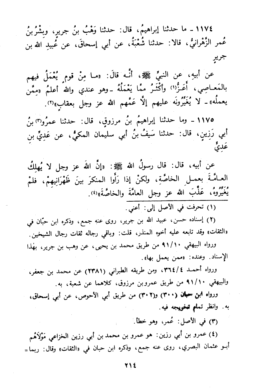 1174 - مَا حَدَّثَنَا إِبْرَاهِيمُ، قَالَ: حَدَّثَنَا وَهْبُ بْنُ جَرِيرٍ، وَبِشْرُ بْنُ عُمَرَ الزَّهْرَانِيُّ، قَالَا: حَدَّثَنَا شُعْبَةُ، عَنْ أَبِي إِسْحَاقَ، عَنْ عُبَيْدِ اللهِ بْنِ جَرِيرٍ، عَنْ أَبِيهِ، عَنِ النَّبِيِّ صَلَّى اللَّهُ عَلَيْهِ وَسَلَّمَ أَنَّهُ قَالَ: " مَا مِنْ قَوْمٍ يُعْمَلُ فِيهِمْ بِالْمَعَاصِي أَعَزُّ , وَأَكْثَرُ مِمَّا يَعْمَلُهُ وَهُوَ عِنْدِي وَاللهُ أَعْلَمُ مِمَّنْ يَعْمَلُهُ لَا يُغَيِّرُونَهُ عَلَيْهِمْ إِلَّا عَمَّهُمُ اللهُ عَزَّ وّجَلَّ بِعِقَابٍ "