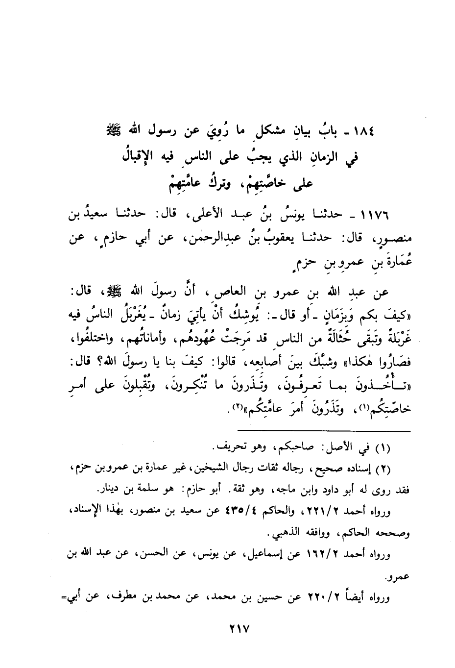 1176 - حَدَّثَنَا يُونُسُ بْنُ عَبْدِ الْأَعْلَى، قَالَ: حَدَّثَنَا سَعِيدُ بْنُ مَنْصُورٍ، قَالَ: حَدَّثَنَا يَعْقُوبُ بْنُ عَبْدِ الرَّحْمَنِ، عَنْ أَبِي حَازِمٍ، عَنْ عُمَارَةَ بْنِ عَمْرِو بْنِ حَزْمٍ، عَنْ عَبْدِ اللهِ بْنِ عَمْرِو بْنِ الْعَاصِ، أَنَّ رَسُولَ اللهِ صَلَّى اللَّهُ عَلَيْهِ وَسَلَّمَ قَالَ: " كَيْفَ بِكُمْ وَبِزَمَانٍ، أَوْ قَالَ: يُوشِكُ أَنْ يَأْتِيَ زَمَانٌ، يُغَرْبَلُ النَّاسُ فِيهِ غَرْبَلَةً وَتَبْقَى حُثَالَةٌ مِنَ النَّاسِ قَدْ مَرِجَتْ عُهُودُهُمْ وَأَمَانَاتُهُمْ وَاخْتَلَفُوا فَصَارُوا هَكَذَا " وَشَبَّكَ بَيْنَ أَصَابِعِهِ، قَالُوا: كَيْفَ بِنَا يَا رَسُولَ اللهِ؟ قَالَ: " تَأْخُذُونَ بِمَا تَعْرِفُونَ وَتَذْرُونَ مَا تُنْكِرُونَ وَتُقْبِلُونَ عَلَى أَمْرِ خَاصَّتِكُمْ وَتَذَرُونَ أَمْرَ عَامَّتِكُمْ " -[218]-