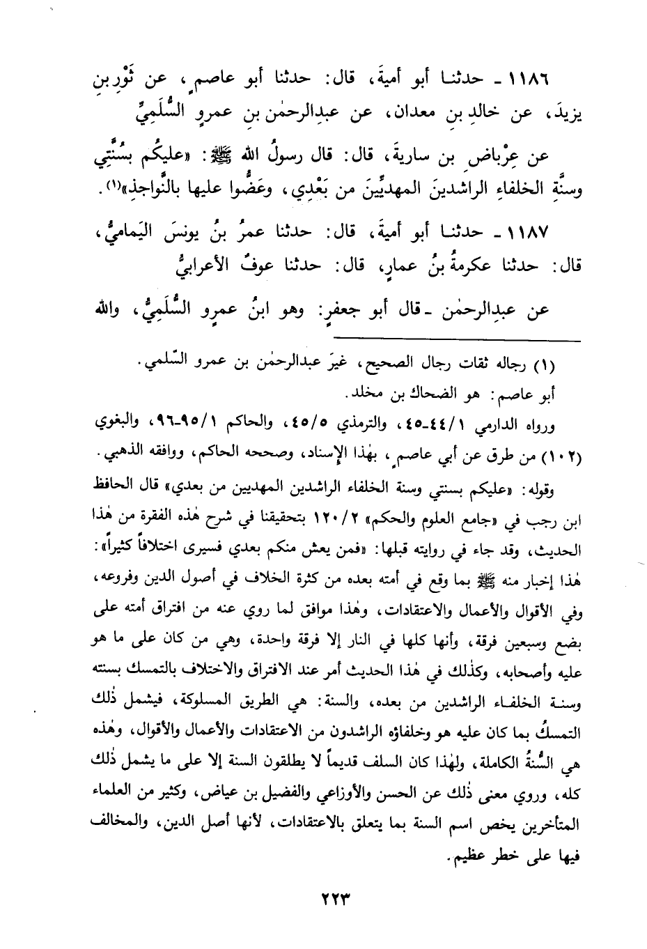 1186 - حَدَّثَنَا أَبُو أُمَيَّةَ، قَالَ: حَدَّثَنَا أَبُو عَاصِمٍ، عَنْ ثَوْرِ بْنِ يَزِيدَ، عَنْ خَالِدِ بْنِ مَعْدَانَ، عَنْ عَبْدِ الرَّحْمَنِ بْنِ عَمْرٍو السُّلَمِيِّ، عَنْ عِرْبَاضِ بْنِ سَارِيَةَ، قَالَ: قَالَ رَسُولُ اللهِ صَلَّى اللَّهُ عَلَيْهِ وَسَلَّمَ: " عَلَيْكُمْ بِسُنَّتِي وَسُنَّةِ الْخُلَفَاءِ الرَّاشِدِينَ الْمَهْدِيِّينَ مِنْ بَعْدِي وَعَضُّوا عَلَيْهَا بِالنَّوَاجِذِ "
