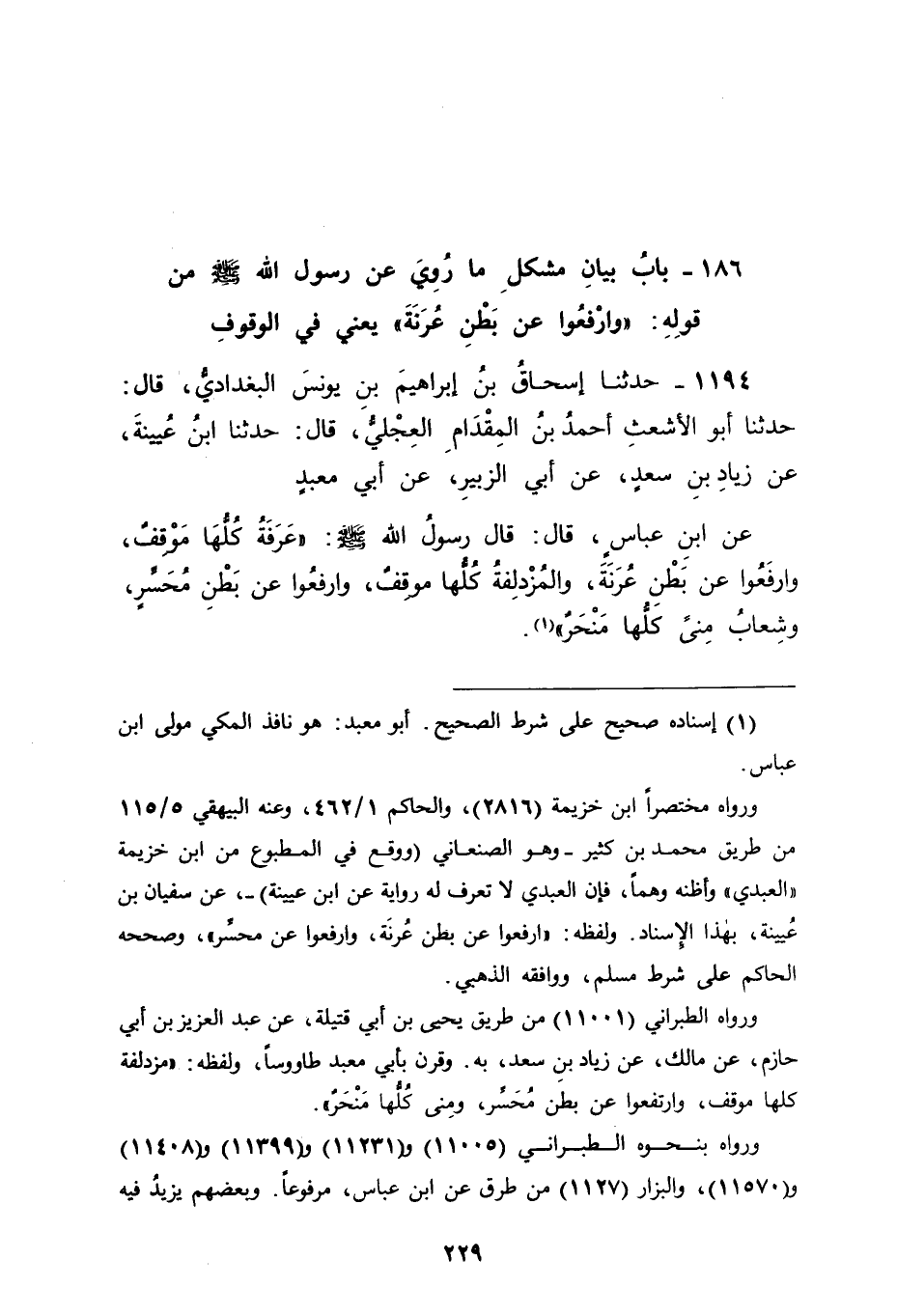 1194 - حَدَّثَنَا إِسْحَاقُ بْنُ إِبْرَاهِيمَ بْنِ يُونُسَ الْبَغْدَادِيُّ، قَالَ: حَدَّثَنَا أَبُو الْأَشْعَثِ أَحْمَدُ بْنُ الْمِقْدَامِ الْعِجْلِيُّ قَالَ: حَدَّثَنَا ابْنُ عُيَيْنَةَ، عَنْ زِيَادِ بْنِ سَعْدٍ، عَنْ أَبِي الزُّبَيْرِ، عَنْ أَبِي مَعْبَدٍ، عَنِ ابْنِ عَبَّاسٍ، قَالَ: قَالَ رَسُولُ اللهِ صَلَّى اللَّهُ عَلَيْهِ وَسَلَّمَ: " عَرَفَةُ كُلُّهَا مَوْقِفٌ، وَارْفَعُوا عَنْ بَطْنِ عُرَنَةَ , وَالْمُزْدَلِفَةُ كُلُّهَا مَوْقِفٌ، وَارْفَعُوا عَنْ بَطْنِ مُحَسِّرٍ , وَشِعَابُ مِنًى كُلُّهَا مَنْحَرٌ " -[230]- قَالَ أَبُو جَعْفَرٍ: وَلَمْ نَجِدْ هَذَا الْحَدِيثَ مِنْ رِوَايَةِ أَحَدٍ مِنْ أَصْحَابِ ابْنِ عُيَيْنَةَ فِي إِسْنَادِهِ أَتَمَّ مِنْهُ مِنْ رِوَايَةِ أَبِي الْأَشْعَثِ وَقَدْ حَدَّثَنَا عِيسَى بْنُ إِبْرَاهِيمَ الْغَافِقِيُّ بِهِ نَاقِصًا فِي إِسْنَادِهِ وَفِي مَتْنِهِ جَمِيعًا