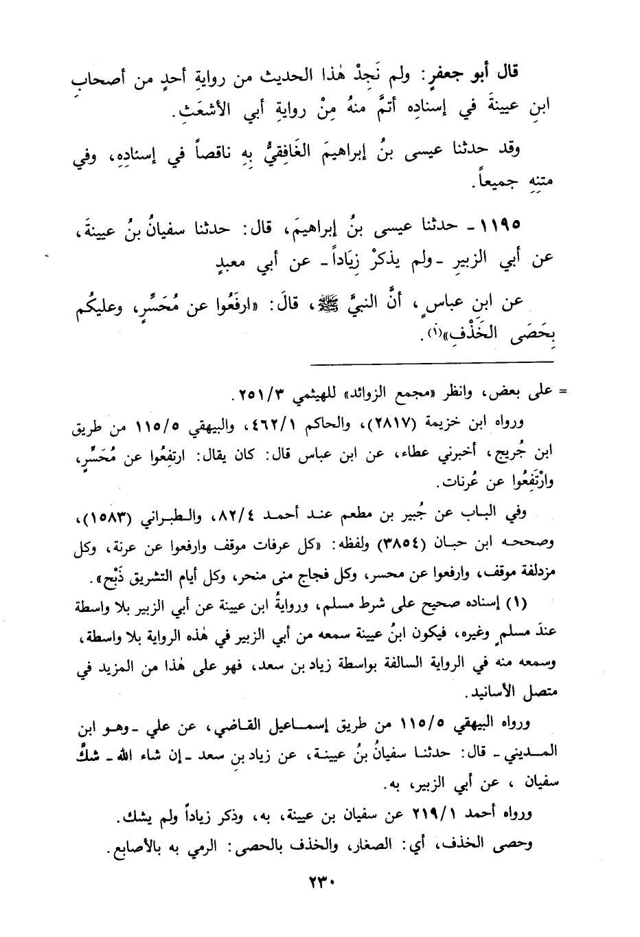 1195 - حَدَّثَنَا عِيسَى بْنُ إِبْرَاهِيمَ، قَالَ: حَدَّثَنَا سُفْيَانُ بْنُ عُيَيْنَةَ، عَنْ أَبِي الزُّبَيْرِ، وَلَمْ يَذْكُرْ زِيَادًا عَنْ أَبِي مَعْبَدٍ، عَنِ ابْنِ عَبَّاسٍ، أَنَّ النَّبِيَّ صَلَّى اللَّهُ عَلَيْهِ وَسَلَّمَ قَالَ: " ارْفَعُوا عَنْ مُحَسِّرٍ، وَعَلَيْكُمْ بِحَصَى الْخَذْفِ " -[231]- قَالَ أَبُو جَعْفَرٍ: فَاحْتَجْنَا إِلَى الْوُقُوفِ عَلَى قَوْلِهِ صَلَّى اللَّهُ عَلَيْهِ وَسَلَّمَ: " ارْفَعُوا عَنْ بَطْنِ عُرَنَةَ " مَا الَّذِي يُرِيدُ بِهِ؟ هَلْ هُوَ لِأَنَّ بَطْنَ عُرَنَةَ لَيْسَ مِنْ عَرَفَةَ الَّتِي يُوقَفُ بِهَا لِلْحَجِّ أَمْ لِغَيْرِ ذَلِكَ؟