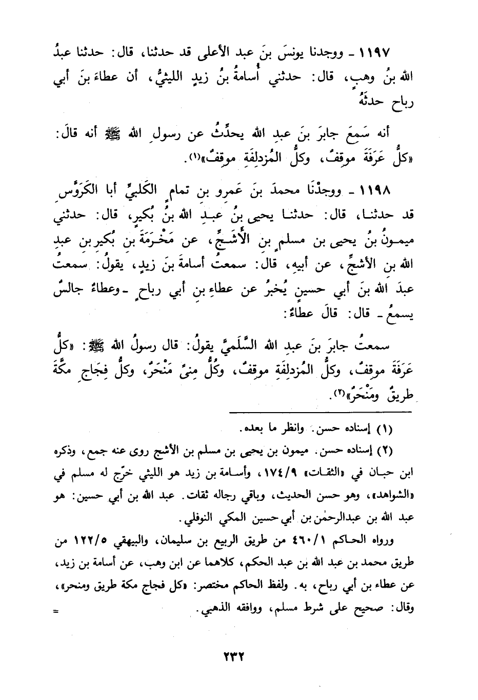 1198 - وَوَجَدْنَا مُحَمَّدَ بْنَ عَمْرِو بْنِ تَمَّامٍ الْكَلْبِيَّ أَبَا الْكَرَوَّسِ قَدْ حَدَّثَنَا قَالَ: حَدَّثَنَا يَحْيَى بْنُ عَبْدِ اللهِ بْنِ بُكَيْرٍ، قَالَ: حَدَّثَنِي مَيْمُونُ بْنُ يَحْيَى بْنِ مُسْلِمِ بْنِ الْأَشَجِّ، عَنْ مَخْرَمَةَ بْنِ بُكَيْرِ بْنِ عَبْدِ اللهِ بْنِ الْأَشَجِّ، عَنْ أَبِيهِ، قَالَ: سَمِعْتُ أُسَامَةَ بْنَ زَيْدٍ، يَقُولُ: سَمِعْتُ عَبْدَ اللهِ بْنَ أَبِي حُسَيْنٍ، يُخْبِرُ عَنْ عَطَاءِ بْنِ أَبِي رَبَاحٍ، وَعَطَاءٌ، جَالِسٌ يَسْمَعُ قَالَ: قَالَ عَطَاءٌ: سَمِعْتُ جَابِرَ بْنَ عَبْدِ اللهِ السُّلَمِيَّ يَقُولُ: قَالَ رَسُولُ اللهِ صَلَّى اللَّهُ عَلَيْهِ وَسَلَّمَ: " كُلُّ عَرَفَةَ مَوْقِفٌ، وَكُلُّ الْمُزْدَلِفَةِ مَوْقِفٌ، وَكُلُّ مِنًى مَنْحَرٌ، وَكُلُّ فِجَاجِ مَكَّةَ طَرِيقٌ وَمَنْحَرٌ "