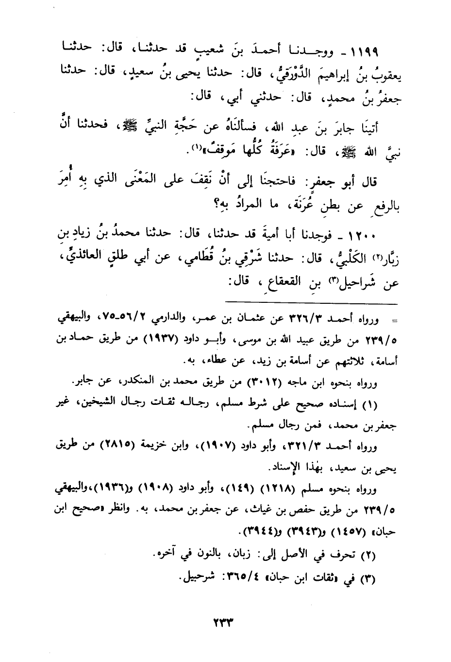 1199 - وَوَجَدْنَا أَحْمَدَ بْنَ شُعَيْبٍ قَدْ حَدَّثَنَا قَالَ: حَدَّثَنَا يَعْقُوبُ بْنُ إِبْرَاهِيمَ الدَّوْرَقِيُّ، قَالَ: حَدَّثَنَا يَحْيَى بْنُ سَعِيدٍ، قَالَ: حَدَّثَنَا جَعْفَرُ بْنُ مُحَمَّدٍ، قَالَ: حَدَّثَنِي أَبِي قَالَ: أَتَيْنَا جَابِرَ بْنَ عَبْدِ اللهِ فَسَأَلْنَاهُ عَنْ حَجَّةِ النَّبِيِّ صَلَّى اللَّهُ عَلَيْهِ وَسَلَّمَ فَحَدَّثَنَا أَنَّ نَبِيَّ اللهِ صَلَّى اللَّهُ عَلَيْهِ وَسَلَّمَ قَالَ: " عَرَفَةُ كُلُّهَا مَوْقِفٌ " قَالَ أَبُو جَعْفَرٍ: فَاحْتَجْنَا إِلَى أَنْ نَقِفَ عَلَى الْمَعْنَى الَّذِي بِهِ أُمِرَ بِالرَّفْعِ عَنْ بَطْنِ عُرَنَةَ مَا الْمُرَادُ بِهِ