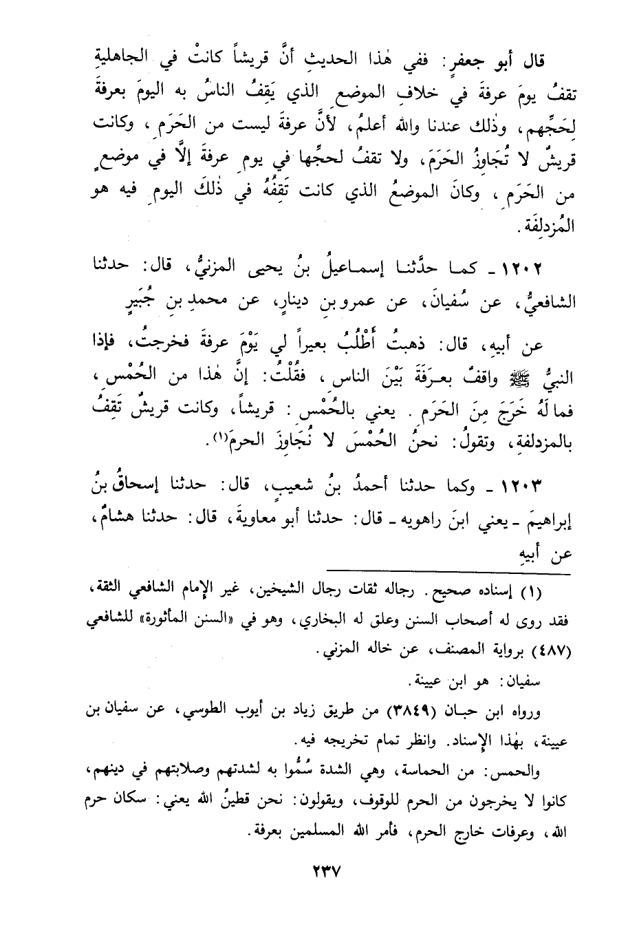 1202 - كَمَا حَدَّثَنَا إِسْمَاعِيلُ بْنُ يَحْيَى الْمُزَنِيُّ، قَالَ: ثَنَا الشَّافِعِيُّ، عَنْ سُفْيَانَ، عَنْ عَمْرِو بْنِ دِينَارٍ، عَنْ مُحَمَّدِ بْنِ جُبَيْرٍ، عَنْ أَبِيهِ، قَالَ: " ذَهَبْتُ أَطْلُبُ بَعِيرًا لِي يَوْمَ عَرَفَةَ فَخَرَجْتُ، فَإِذَا النَّبِيُّ صَلَّى اللَّهُ عَلَيْهِ وَسَلَّمَ وَاقِفٌ بِعَرَفَةَ بَيْنَ النَّاسِ، فَقُلْتُ: إِنَّ هَذَا مِنَ الْحُمْسِ، فَمَا لَهُ خَرَجَ مِنَ الْحَرَمِ يَعْنِي بِالْحُمْسِ قُرَيْشًا وَكَانَتْ قُرَيْشٌ تَقِفُ بِالْمُزْدَلِفَةِ وَتَقُولُ: نَحْنُ الْحُمْسُ لَا نُجَاوِزُ الْحَرَمَ "