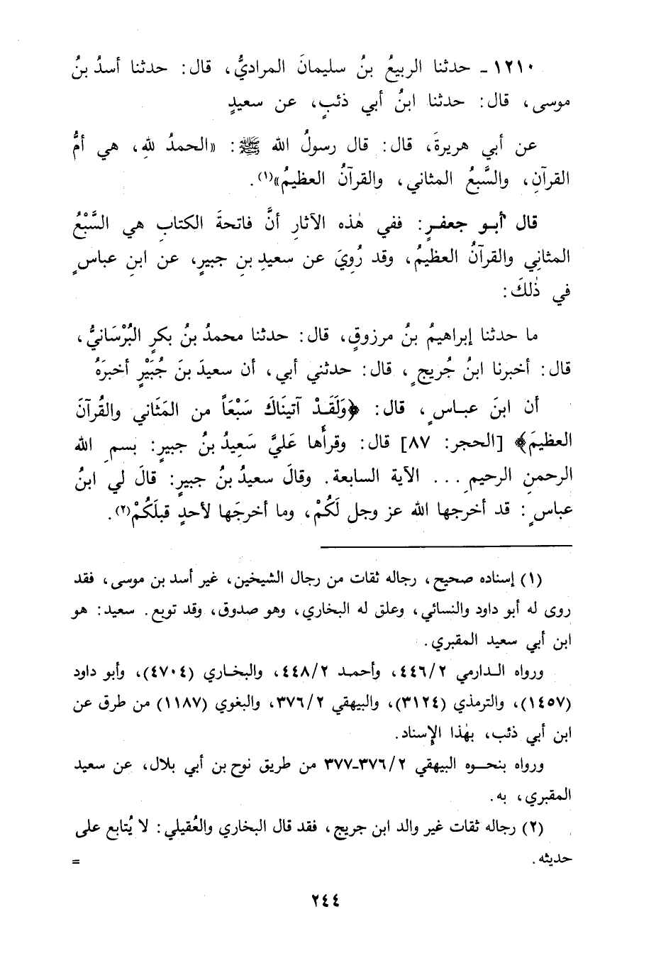 1210 - حَدَّثَنَا الرَّبِيعُ بْنُ سُلَيْمَانَ الْمُرَادِيُّ، قَالَ: حَدَّثَنَا أَسَدُ بْنُ مُوسَى، قَالَ: حَدَّثَنَا ابْنُ أَبِي ذِئْبٍ، عَنْ سَعِيدٍ، عَنْ أَبِي هُرَيْرَةَ، قَالَ: قَالَ رَسُولُ اللهِ صَلَّى اللَّهُ عَلَيْهِ وَسَلَّمَ: " الْحَمْدُ لِلَّهِ هِيَ أُمُّ الْقُرْآنِ، وَالسَّبْعُ الْمَثَانِي، وَالْقُرْآنُ الْعَظِيمُ " قَالَ أَبُو جَعْفَرٍ: فَفِي هَذِهِ الْآثَارِ أَنَّ فَاتِحَةَ الْكِتَابِ هِيَ السَّبْعُ الْمَثَانِي وَالْقُرْآنُ الْعَظِيمُ، وَقَدْ رُوِيَ عَنْ سَعِيدِ بْنِ جُبَيْرٍ عَنِ ابْنِ عَبَّاسٍ فِي ذَلِكَ