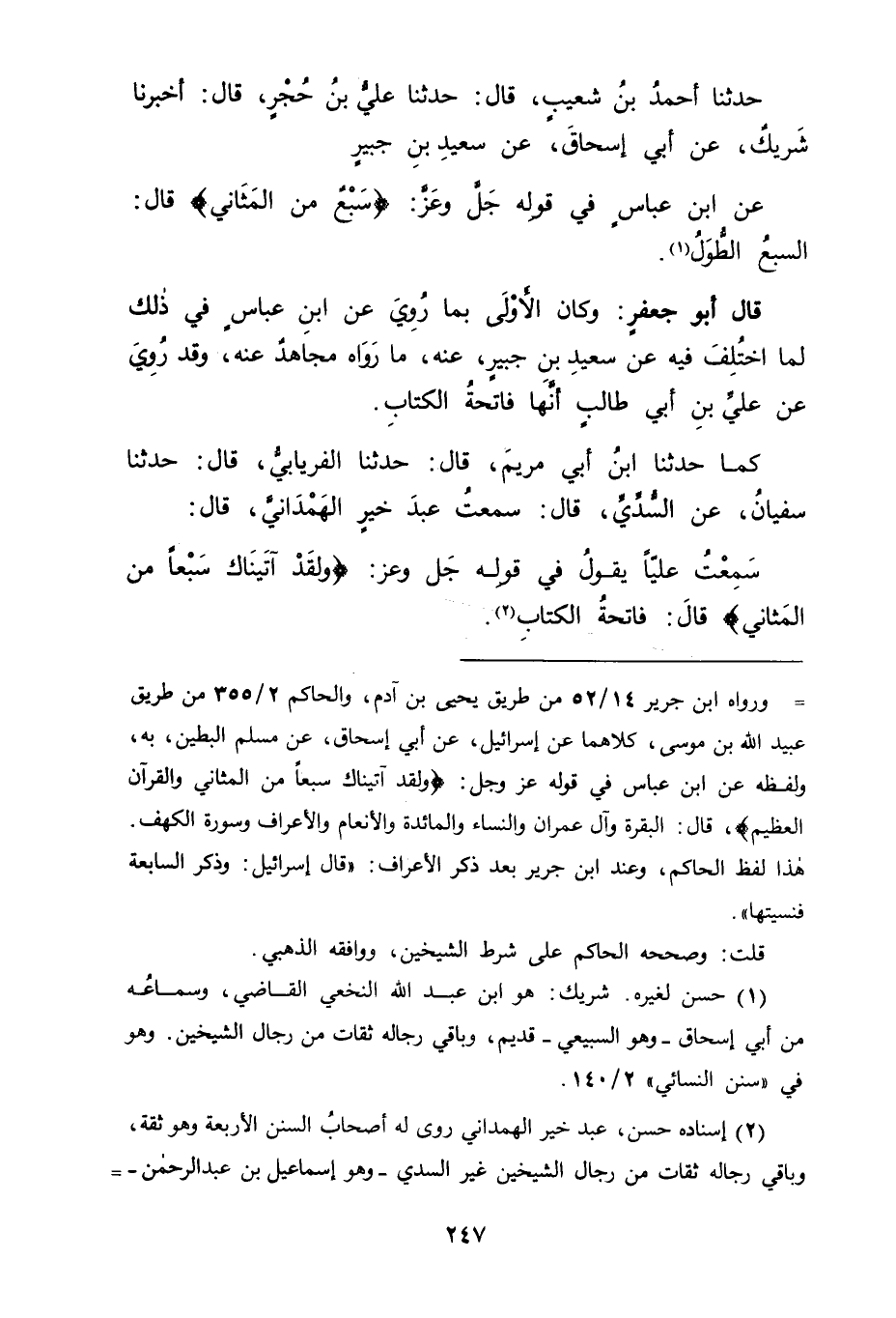 حَدَّثَنَا أَحْمَدُ بْنُ شُعَيْبٍ قَالَ: حَدَّثَنَا عَلِيُّ بْنُ حُجْرٍ قَالَ: أَخْبَرَنَا شَرِيكٌ عَنْ أَبِي إِسْحَاقَ عَنْ سَعِيدِ بْنِ جُبَيْرٍ عَنِ ابْنِ عَبَّاسٍ فِي قَوْلِهِ جَلَّ وَعَزَّ: {سَبْعًا مِنَ الْمَثَانِي} [الحجر: 87] قَالَ " السَّبْعُ الطُّوَلُ " قَالَ أَبُو جَعْفَرٍ: وَكَانَ الْأَوْلَى بِمَا رُوِيَ عَنِ ابْنِ عَبَّاسٍ فِي ذَلِكَ لِمَا اخْتُلِفَ فِيهِ عَنْ سَعِيدِ بْنِ جُبَيْرٍ عَنْهُ مَا رَوَاهُ مُجَاهِدٌ عَنْهُ، وَقَدْ رُوِيَ عَنْ عَلِيِّ بْنِ أَبِي طَالِبٍ أَنَّهَا فَاتِحَةُ الْكِتَابِ