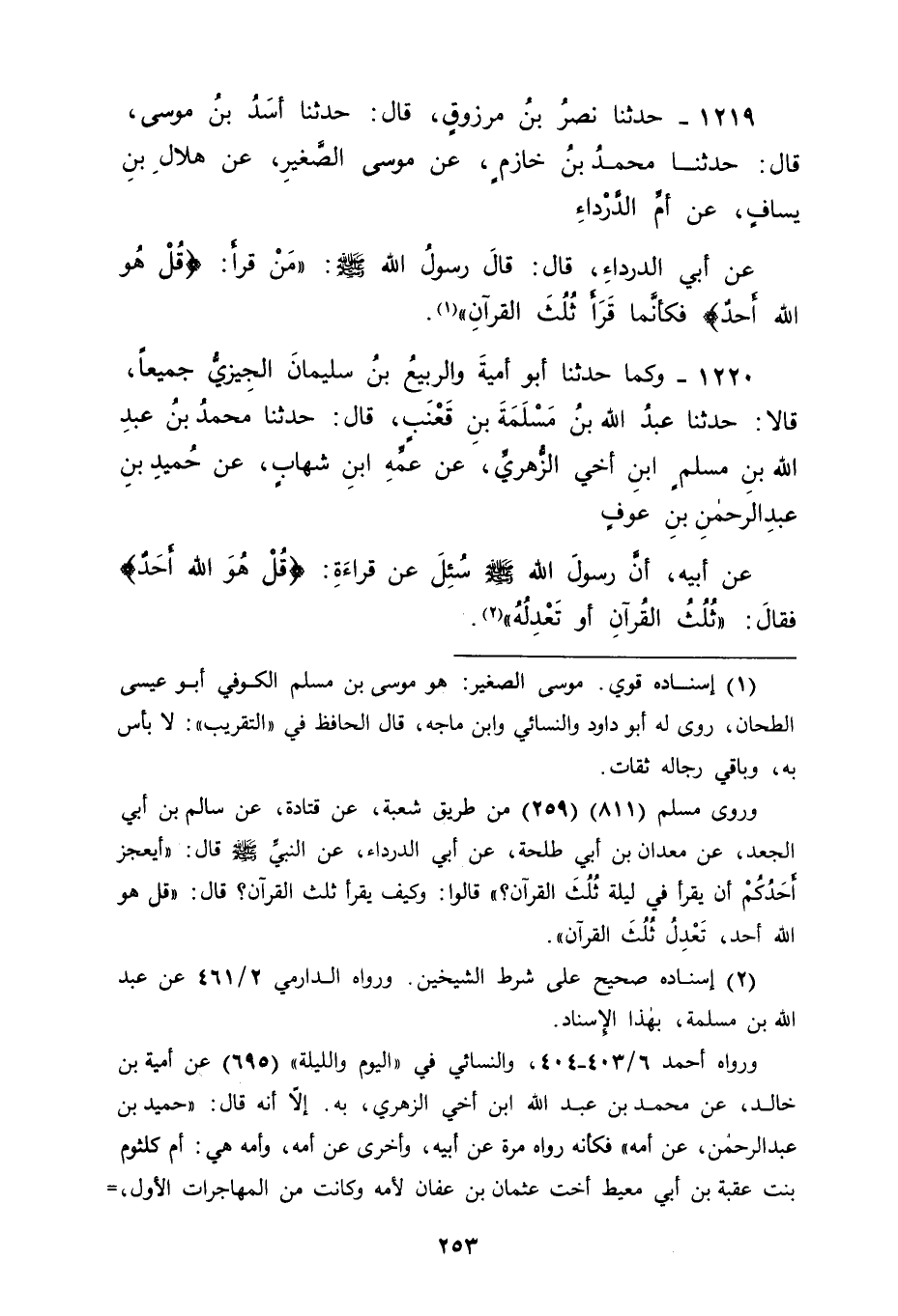 1219 - حَدَّثَنَا نَصْرُ بْنُ مَرْزُوقٍ، قَالَ: حَدَّثَنَا أَسَدُ بْنُ مُوسَى، قَالَ: حَدَّثَنَا مُحَمَّدُ بْنُ خَازِمٍ، عَنْ مُوسَى الصَّغِيرِ، عَنْ هِلَالِ بْنِ يَسَافٍ، عَنْ أُمِّ الدَّرْدَاءِ، عَنْ أَبِي الدَّرْدَاءِ قَالَ: قَالَ رَسُولُ اللهِ صَلَّى اللَّهُ عَلَيْهِ وَسَلَّمَ: " مَنْ قَرَأَ قُلْ هُوَ اللهُ أَحَدٌ فَكَأَنَّمَا قَرَأَ ثُلُثَ الْقُرْآنِ "