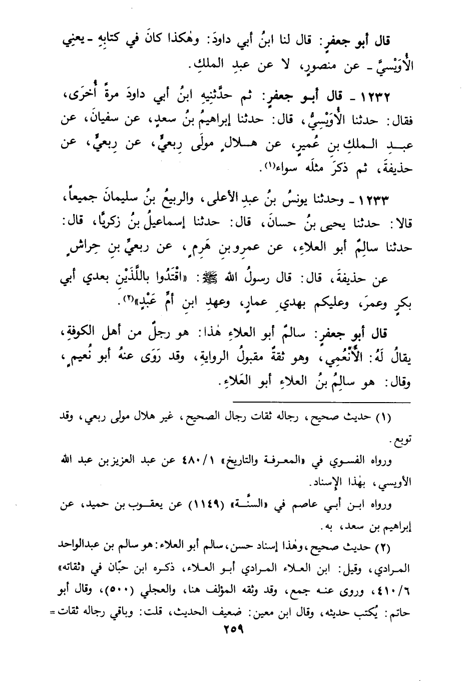 1233 - وَحَدَّثَنَا يُونُسُ بْنُ عَبْدِ الْأَعْلَى، وَالرَّبِيعُ بْنُ سُلَيْمَانَ، جَمِيعًا قَالَا: حَدَّثَنَا يَحْيَى بْنُ حَسَّانَ، قَالَ: حَدَّثَنَا إِسْمَاعِيلُ بْنُ زَكَرِيَّا، قَالَ: حَدَّثَنَا سَالِمٌ أَبُو الْعَلَاءِ، عَنْ عَمْرِو بْنِ هَرِمٍ، عَنْ رِبْعِيِّ بْنِ حِرَاشٍ، عَنْ حُذَيْفَةَ، قَالَ: قَالَ رَسُولُ اللهِ صَلَّى اللَّهُ عَلَيْهِ وَسَلَّمَ: " اقْتَدُوا بِاللَّذَيْنِ بَعْدِي أَبِي بَكْرٍ وَعُمَرَ وَعَلَيْكُمْ بِهَدْيِ عَمَّارٍ وَعَهْدِ ابْنِ أُمِّ عَبْدٍ " قَالَ أَبُو جَعْفَرٍ: سَالِمٌ أَبُو الْعَلَاءِ هَذَا هُوَ رَجُلٌ مِنْ أَهْلِ الْكُوفَةِ يُقَالُ لَهُ: الْأَنْعُمِيُّ، وَهُوَ ثِقَةٌ مَقْبُولُ الرِّوَايَةِ. وَقَدْ رَوَى عَنْهُ أَبُو نُعَيْمٍ، وَقَالَ: هُوَ سَالِمُ بْنُ الْعَلَاءِ أَبُو الْعَلَاءِ. -[260]- قَالَ أَبُو جَعْفَرٍ: فَتَأَمَّلْنَا هَذَا الْحَدِيثَ، فَكَانَ مَا فِيهِ مِمَّا أَمَرَ بِهِ رَسُولُ اللهِ صَلَّى اللَّهُ عَلَيْهِ وَسَلَّمَ النَّاسَ بِالِاقْتِدَاءِ بِأَبِي بَكْرٍ وَعُمَرَ رَضِيَ اللهُ عَنْهُما مَعْنَاهُ عِنْدَنَا , وَاللهُ أَعْلَمُ أَنْ يَمْتَثِلُوا مَا هُمَا عَلَيْهِ , وَأَنْ يَحْذُوا حَذْوَهُمَا فِيمَا يَكُونُ مِنْهُمَا فِي أَمْرِ الدِّينِ , وَأَنْ لَا يَخْرُجُوا عَنْهُ إِلَى غَيْرِهِ، ثُمَّ تَأَمَّلْنَا مَا أَمَرَهُمْ بِهِ مِنَ الِاهْتِدَاءِ بِهَدْيِ عَمَّارٍ رَضِيَ اللهُ عَنْهُ، فَوَجَدْنَا الِاهْتِدَاءَ هُوَ التَّقَرُّبَ إِلَى اللهِ عَزَّ وَجَلَّ بِالْأَعْمَالِ الصَّالِحَةِ , وَكَانَ عَمَّارٌ مِنْ أَهْلِهَا، فَأَمَرَهُمْ أَنْ يَهْتَدُوا بِمَا هُوَ عَلَيْهِ مِنْهَا , وَأَنْ يَكُونُوا فِيهَا كَهُوَ فِيهَا , وَلَيْسَ ذَلِكَ بِمُخْرِجٍ لِغَيْرِهِ مِنْ أَصْحَابِ رَسُولِ اللهِ صَلَّى اللَّهُ عَلَيْهِ وَسَلَّمَ عَنْ تِلْكَ الْمَنْزِلَةِ ; لِأَنَّ الْقَصْدَ بِمِثْلِ هَذَا إِلَى الْوَاحِدِ مِنْ أَهْلِهِ لَا يَنْفِي بَقِيَّةَ أَهْلِهِ أَنْ يَكُونُوا فِيهِ مِثْلَهُ كَمَا يَقُولُ الرَّجُلُ: مَوْضِعُ فُلَانٍ مِنَ الْعِبَادَةِ الْمَوْضِعُ الَّذِي يَنْبَغِي أَنْ يُتَمَسَّكَ بِهِ , وَلَيْسَ فِي ذَلِكَ مَا يَنْفِي أَنْ يَكُونَ هُنَاكَ آخَرُونَ فِي الْعِبَادَةِ مِثْلَهُ أَوْ فَوْقَهُ مِمَّنْ يَجِبُ أَنْ يَكُونُوا فِي الِاهْتِدَاءِ بِهِمْ فِي ذَلِكَ كَالِاهْتِدَاءِ بِهِ فِيهِ