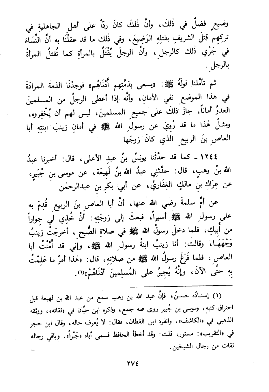 1244 - كَمَا قَدْ حَدَّثَنَا يُونُسُ بْنُ عَبْدِ الْأَعْلَى، قَالَ: أَخْبَرَنَا عَبْدُ اللهِ بْنُ وَهْبٍ، قَالَ: حَدَّثَنِي عَبْدُ اللهِ بْنُ لَهِيعَةَ، عَنْ مُوسَى بْنِ جُبَيْرٍ، عَنْ عِرَاكِ بْنِ مَالِكٍ الْغِفَارِيِّ، عَنْ أَبِي بَكْرِ بْنِ عَبْدِ الرَّحْمَنِ، عَنْ أُمِّ سَلَمَةَ رَضِيَ اللهُ عَنْهَا أَنَّ أَبَا الْعَاصِ بْنَ الرَّبِيعِ قُدِمَ بِهِ عَلَى رَسُولِ اللهِ صَلَّى اللَّهُ عَلَيْهِ وَسَلَّمَ أَسِيرًا، فَبَعَثَ إِلَى زَوْجَتِهِ أَنْ خُذِي لِي جِوَارًا مِنْ أَبِيكِ , فَلَمَّا دَخَلَ رَسُولُ اللهِ صَلَّى اللَّهُ عَلَيْهِ وَسَلَّمَ فِي صَلَاةِ الصُّبْحِ أَخْرَجَتْ زَيْنَبُ وَجْهَهَا وَقَالَتْ: أَنَا زَيْنَبُ ابْنَةُ رَسُولِ اللهِ صَلَّى اللَّهُ عَلَيْهِ وَسَلَّمَ وَإِنِّي قَدْ أَمَّنْتُ أَبَا الْعَاصِ فَلَمَّا فَرَغَ رَسُولُ اللهِ صَلَّى اللَّهُ عَلَيْهِ وَسَلَّمَ مِنْ صَلَاتِهِ قَالَ: " هَذَا أَمْرٌ مَا عَلِمْتُ بِهِ حَتَّى الْآنَ، وَإِنَّهُ يُجِيرُ عَلَى الْمُسْلِمِينَ أَدْنَاهُمْ "