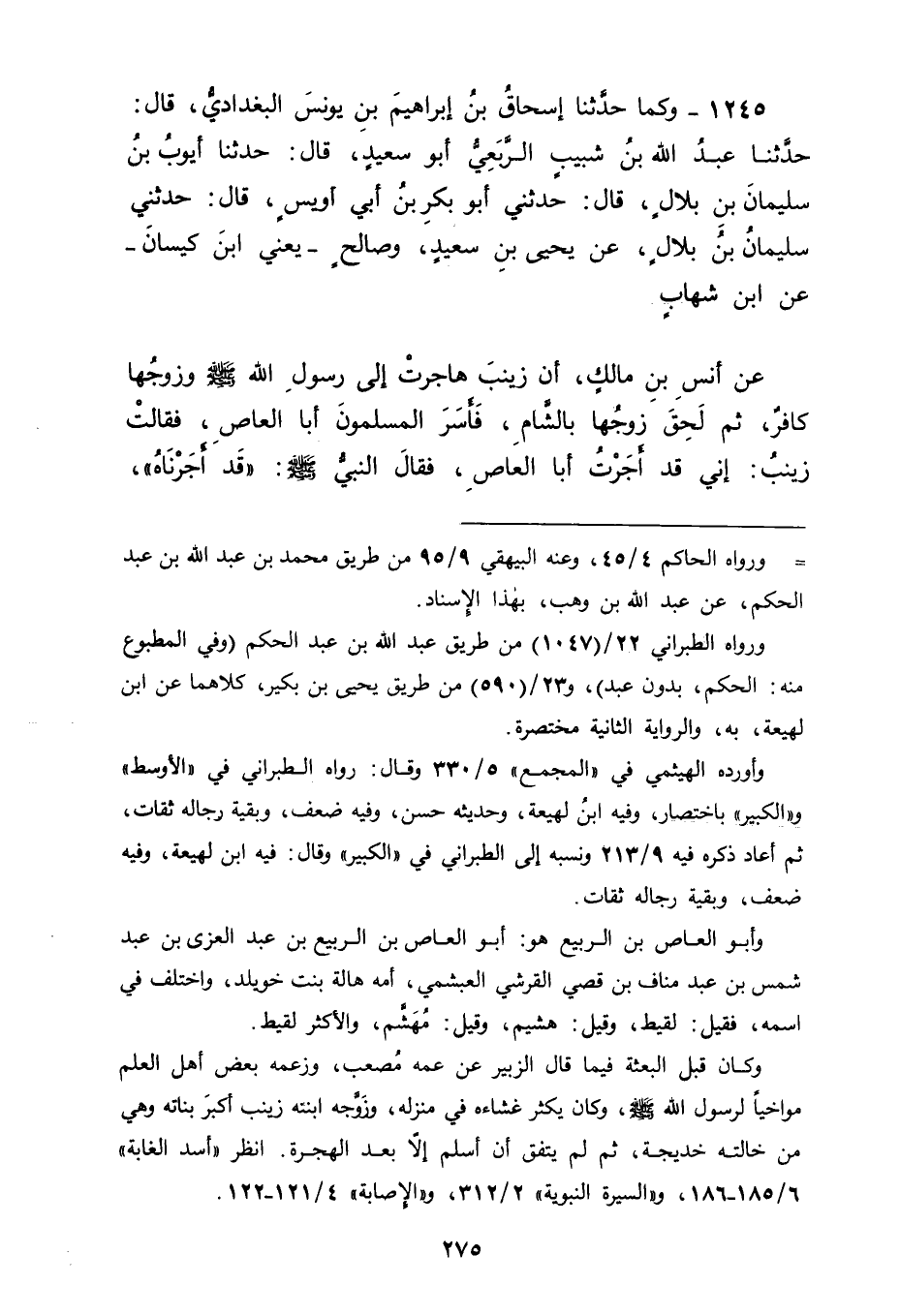 1245 - وَكَمَا حَدَّثَنَا إِسْحَاقُ بْنُ إِبْرَاهِيمَ بْنِ يُونُسَ الْبَغْدَادِيُّ، قَالَ: حَدَّثَنَا عَبْدُ اللهِ بْنُ شَبِيبٍ الرَّبَعِيُّ أَبُو سَعِيدٍ، قَالَ: حَدَّثَنَا أَيُّوبُ بْنُ سُلَيْمَانَ بْنِ بِلَالٍ، قَالَ: حَدَّثَنِي أَبُو بَكْرِ بْنُ أَبِي أُوَيْسٍ، قَالَ: حَدَّثَنِي سُلَيْمَانُ بْنُ بِلَالٍ، عَنْ يَحْيَى بْنِ سَعِيدٍ، وَصَالِح يَعْنِي ابْنَ كَيْسَانَ عَنِ ابْنِ شِهَابٍ، عَنْ أَنَسِ بْنِ مَالِكٍ، أَنَّ زَيْنَبَ هَاجَرَتْ إِلَى رَسُولِ اللهِ صَلَّى اللَّهُ عَلَيْهِ وَسَلَّمَ وَزَوْجُهَا كَافِرٌ , ثُمَّ لَحِقَ زَوْجُهَا بِالشَّامِ فَأَسَرَ الْمُسْلِمُونَ أَبَا الْعَاصِ، فَقَالَتْ زَيْنَبُ إِنِّي قَدْ أَجَرْتُ أَبَا الْعَاصِ، فَقَالَ النَّبِيُّ صَلَّى اللَّهُ عَلَيْهِ وَسَلَّمَ: " قَدْ أَجَرْنَاهُ " , -[276]- وَقَالَ: " يُجِيرُ عَلَى الْمُسْلِمِينَ أَدْنَاهُمْ " قَالَ أَبُو جَعْفَرٍ: فَدَلَّ مَا ذَكَرْنَا عَلَى أَنَّ الْجِوَارَ مِنْ بَعْضِ الْمُسْلِمِينَ كَالْجِوَارِ مِنْ كُلِّهِمْ , فَاحْتُمِلَ أَنْ يَكُونَ قَوْلُهُ صَلَّى اللَّهُ عَلَيْهِ وَسَلَّمَ: " وَإِنَّهُ يُجِيرُ عَلَى الْمُسْلِمِينَ أَدْنَاهُمْ " يَكُونُ ذَلِكَ إرَادَةً مِنْهُ أَنَّ أَدْنَاهُمُ الْمَرْأَةُ , وَاحْتُمِلَ أَنْ يَكُونَ أَدْنَاهُمْ هُوَ الْعَبْدُ , وَيَكُونَ لَمَّا كَانَ أَدْنَاهُمْ وَكَانَ أَمَانُهُ جَائِزًا عَلَيْهِمْ أَنْ تَكُونَ الْمَرْأَةُ الْحُرَّةُ الْمُسْلِمَةُ بِذَلِكَ أَوْلَى مِنْهُ , وَأَنْ يَكُونَ مَا كَانَ مِنْ خِطَابِ النَّبِيِّ صَلَّى اللَّهُ عَلَيْهِ وَسَلَّمَ الْمُسْلِمِينَ بِمَا خَاطَبَهُمْ بِهِ مِنْ هَذَا إِعْلَامًا لَهُمْ أَنَّ ذَلِكَ الْجِوَارَ لَمَّا كَانَ قَدْ يَكُونُ مِنَ الْعَبْدِ الْمُسْلِمِ كَانَ بِأَنْ يَكُونَ مِنَ الْمَرْأَةِ الْحُرَّةِ الْمُسْلِمَةِ أَحْرَى. -[277]- ثُمَّ تَأَمَّلْنَا قَوْلَهُ صَلَّى اللَّهُ عَلَيْهِ وَسَلَّمَ: " لَا يُقْتَلُ مُؤْمِنٌ بِكَافِرٍ وَلَا ذُو عَهْدٍ فِي عَهْدِهِ " فَوَجَدْنَا أَهْلَ الْعِلْمِ فِي تَأْوِيلِ ذَلِكَ عَلَى مَذْهَبَيْنِ مُخْتَلِفَيْنِ: فَطَائِفَةٌ مِنْهُمْ تَقُولُ ذَلِكَ عَلَى التَّقْدِيمِ وَالتَّأْخِيرِ فِي الْمَعْنَى: لَا يُقْتَلُ مُؤْمِنٌ وَلَا ذُو عَهْدٍ فِي عَهْدِهِ بِكَافِرٍ، فَيَكُونُ الْكَافِرُ الْمُرَادُ بِذَلِكَ هُوَ الْكَافِرُ غَيْرُ ذِي الْعَهْدِ , وَهُمُ الَّذِينَ يَقُولُونَ: إِنَّ الْمُؤْمِنَ يُقْتَلُ بِالذِّمِّيِّ إِذَا قَتَلَهُ عَمْدًا , وَمِمَّنْ يَقُولُ ذَلِكَ مِنْ أَهْلِ الْعِلْمِ أَبُو حَنِيفَةَ وَأَبُو يُوسُفَ وَمُحَمَّدُ بْنُ الْحَسَنِ، وَطَائِفَةٌ مِنْهُمْ تَقُولُ: الْكَافِرُ الَّذِي لَا يُقْتَلُ الْمَذْكُورُ فِي هَذَا الْحَدِيثِ هُوَ الْكَافِرُ الْمُعَاهَدُ، لَا يُقْتَلُ فِي عَهْدِهِ عَلَى كَلَامٍ مُسْتَقْبَلٍ بَعْدَ: لَا يُقْتَلُ مُؤْمِنٌ بِكَافِرٍ , وَبَعْدَ انْقِطَاعِ مَعْنَاهُ، وَمِمَّنْ ذَهَبَ إِلَى ذَلِكَ مِنْهُمْ , وَتَأَوَّلَ هَذَا الْحَدِيثَ عَلَى هَذَا الْمَعْنَى الشَّافِعِيُّ فَلَمْ يَقْتُلِ الْمُؤْمِنَ بِالْكَافِرِ الْمُعَاهَدِ , وَقَدْ كَانَ مَالِكُ بْنُ أَنَسٍ يَذْهَبُ إِلَى هَذَا الْمَعْنَى أَنْ لَا يُقْتَلَ مُؤْمِنٌ بِكَافِرٍ مُعَاهَدٍ، فَأَمَّا تَأْوِيلُ الْحَدِيثِ الَّذِي رَوَيْنَاهُ عَنْ رَسُولِ اللهِ صَلَّى اللَّهُ عَلَيْهِ وَسَلَّمَ بِأَنْ " لَا يُقْتَلَ مُؤْمِنٌ بِكَافِرٍ وَلَا ذُو عَهْدٍ بِعَهْدِهِ " فَإِنَّا لَا نَرْوِي عَنْهُ فِي ذَلِكَ شَيْئًا وَلَمَّا أَشْكَلَ هَذَا الْمَعْنَى الَّذِي وَصَفْنَا وَوَقَعَ فِيهِ الِاخْتِلَافُ الَّذِي ذَكَرْنَا تَأَمَّلْنَا ذَلِكَ فَوَجَدْنَا قَوْلَهُ صَلَّى اللَّهُ عَلَيْهِ وَسَلَّمَ: " وَلَا ذُو عَهْدٍ فِي عَهْدِهِ " لَا يَخْلُو مِنْ أَ