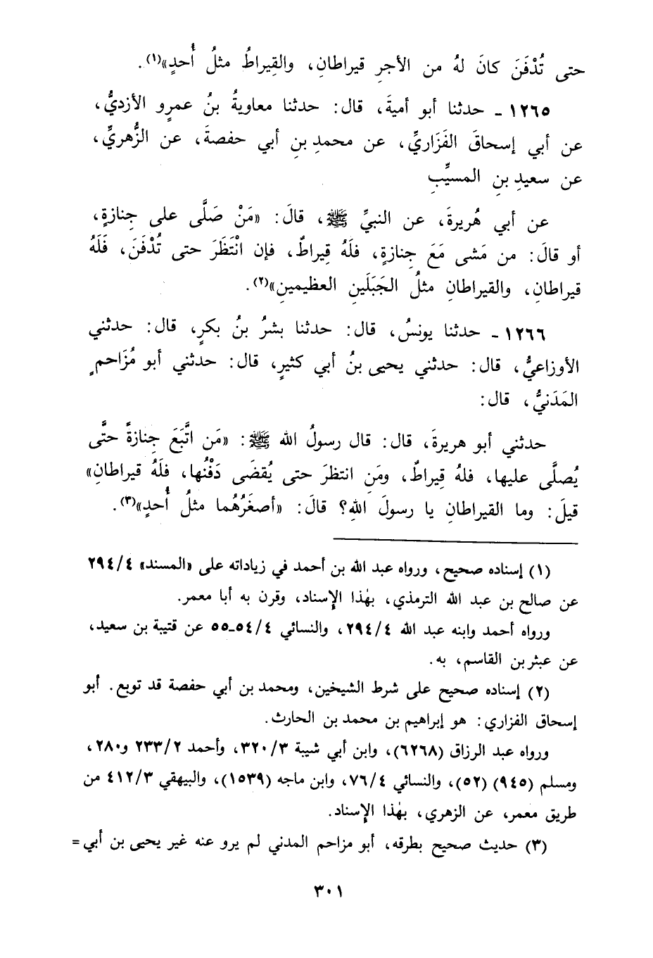 1266 - حَدَّثَنَا يُونُسُ، قَالَ: حَدَّثَنَا بِشْرُ بْنُ بَكْرٍ، قَالَ: حَدَّثَنِي الْأَوْزَاعِيُّ، قَالَ: حَدَّثَنِي يَحْيَى بْنُ أَبِي كَثِيرٍ، قَالَ: حَدَّثَنِي أَبُو مُزَاحِمٍ الْمَدَنِيُّ، قَالَ: حَدَّثَنِي أَبُو هُرَيْرَةَ، قَالَ: قَالَ رَسُولُ اللهِ صَلَّى اللَّهُ عَلَيْهِ وَسَلَّمَ: " مَنِ اتَّبَعَ جِنَازَةً حَتَّى يُصَلَّى عَلَيْهَا فَلَهُ قِيرَاطٌ , وَمَنِ انْتَظَرَ حَتَّى يُقْضَى دَفْنُهَا فَلَهُ قِيرَاطَانِ "، قِيلَ: وَمَا الْقِيرَاطَانِ يَا رَسُولَ اللهِ قَالَ: " أَصْغَرُهُمَا مِثْلُ أُحُدٍ "