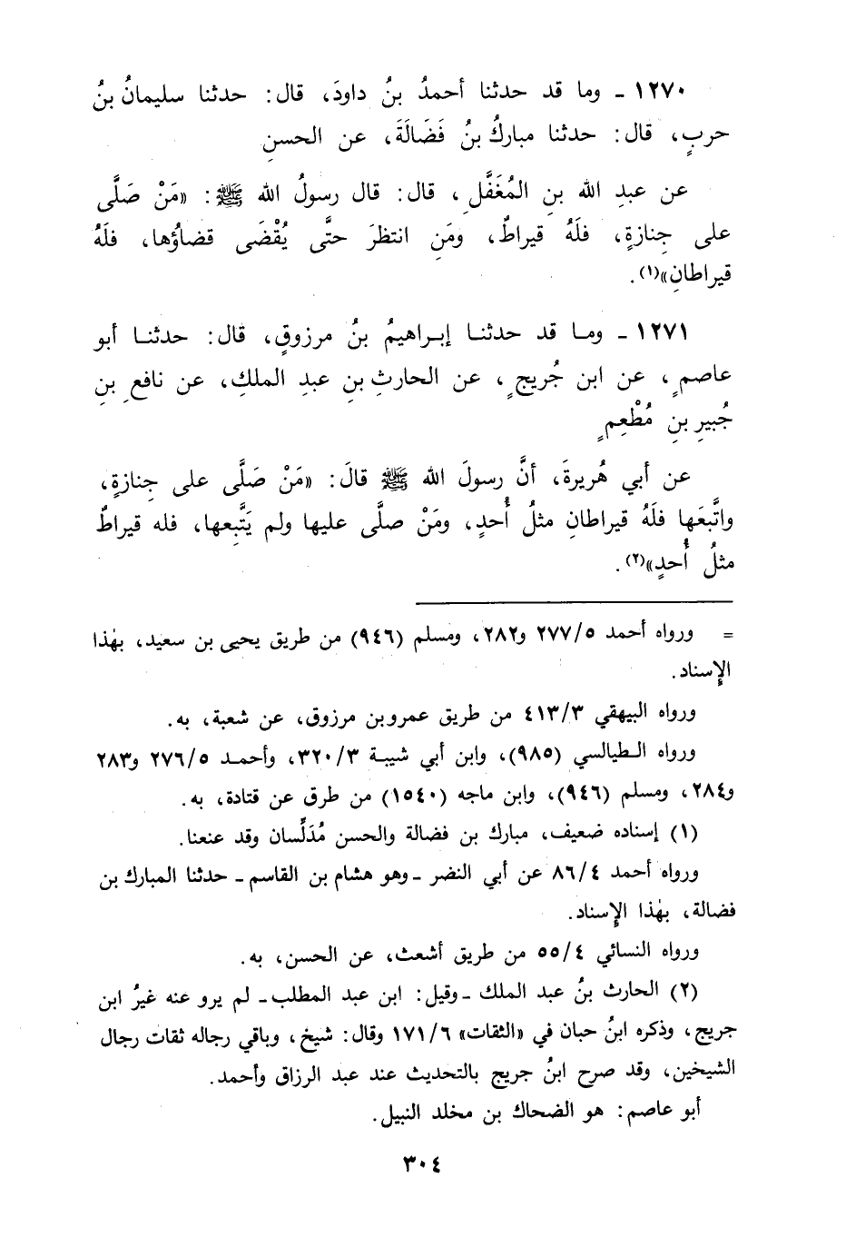 1271 - وَمَا قَدْ حَدَّثَنَا إِبْرَاهِيمُ بْنُ مَرْزُوقٍ، قَالَ: حَدَّثَنَا أَبُو عَاصِمٍ، عَنِ ابْنِ جُرَيْجٍ، عَنِ الْحَارِثِ بْنِ عَبْدِ الْمَلِكِ، عَنْ نَافِعِ بْنِ جُبَيْرِ بْنِ مُطْعِمٍ، عَنْ أَبِي هُرَيْرَةَ، أَنَّ رَسُولَ اللهِ صَلَّى اللَّهُ عَلَيْهِ وَسَلَّمَ قَالَ: " مَنْ صَلَّى عَلَى جِنَازَةٍ وَاتَّبَعَهَا فَلَهُ قِيرَاطَانِ مِثْلُ أُحُدٍ , وَمَنْ صَلَّى عَلَيْهَا وَلَمْ يَتَّبِعْهَا فَلَهُ قِيرَاطٌ مِثْلُ أُحُدٍ " -[305]- فَقَالَ هَذَا الْقَائِلُ: فَهَذِهِ الْآثَارُ فِيهَا ذِكْرُ اسْتِحْقَاقِ الْقِيرَاطِ بِالصَّلَاةِ عَلَى الْجِنَازَةِ خَاصَّةً، أَفَتَجْعَلُونَ هَذَا مُضَادًّا لِمَا فِي الْآثَارِ الْأُوَلِ مِنَ اسْتِحْقَاقِ ذَلِكَ الْقِيرَاطِ أَنَّهُ بِالْمَشْيِ مَعَهَا مِنْ أَهْلِهَا وَالصَّلَاةِ عَلَيْهَا لَا بِدُونِ ذَلِكَ؟ قِيلَ لَهُ: لَيْسَ هَذَا عِنْدَنَا بِتَضَادٍّ وَلَكِنَّهُ عِنْدَنَا , وَاللهُ أَعْلَمُ عَلَى حِفْظِ بَعْضِ رُوَاتِهَا لِمَا أَغْفَلَهُ بَقِيَّتُهُمْ، فَيَكُونُ الصَّحِيحُ عَنْ رَسُولِ اللهِ صَلَّى اللَّهُ عَلَيْهِ وَسَلَّمَ مِمَّا يَسْتَحِقُّ بِهِ ذَلِكَ الْقِيرَاطَ هُوَ بِالْمَشْيِ مَعَ الْجِنَازَةِ مِنْ أَهْلِهَا وَالصَّلَاةِ عَلَيْهَا , وَيَكُونُ مَا سِوَى ذَلِكَ مِمَّا لَيْسَ فِيهِ ذِكْرُ الْمَشْيِ مَعَهَا إغْفَالًا مِنْ رُوَاتِهَا , وَمَنْ حَفِظَ شَيْئًا كَانَ حُجَّةً عَلَى مَنْ لَمْ يَحْفَظْهُ، فَإِنْ قَالَ قَائِلٌ: وَهَلْ جُزْءُ الْقِيرَاطِ مِنَ الشَّيْءِ الَّذِي هُوَ مِنْهُ جُزْءٌ مَعْلُومٌ مَوْجُودٌ فِي شَيْءٍ مِنَ الْآثَارِ عَنْ رَسُولِ اللهِ صَلَّى اللَّهُ عَلَيْهِ وَسَلَّمَ؟ قِيلَ لَهُ: مَا وَجَدْنَا لِذَلِكَ ذِكْرًا فِي شَيْءٍ رُوِيَ عَنْ رَسُولِ اللهِ صَلَّى اللَّهُ عَلَيْهِ وَسَلَّمَ غَيْرَ شَيْءٍ مِنْ حَدِيثِ أَبِي هُرَيْرَةَ