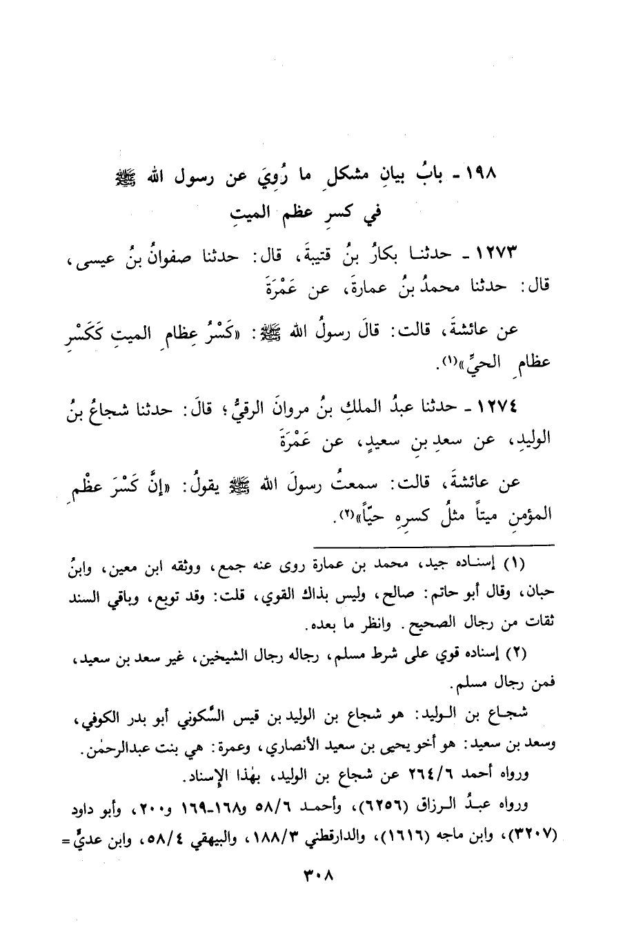 1274 - حَدَّثَنَا عَبْدُ الْمَلِكِ بْنُ مَرْوَانَ الرَّقِّيُّ، قَالَ: حَدَّثَنَا شُجَاعُ بْنُ الْوَلِيدِ، عَنْ سَعْدِ بْنِ سَعِيدٍ، عَنْ عَمْرَةَ، عَنْ عَائِشَةَ قَالَتْ: سَمِعْتُ رَسُولَ اللهِ صَلَّى اللَّهُ عَلَيْهِ وَسَلَّمَ يَقُولُ: " إِنَّ كَسْرَ عَظْمِ الْمُؤْمِنِ مَيِّتًا مِثْلُ كَسْرِهِ حَيًّا " -[309]-