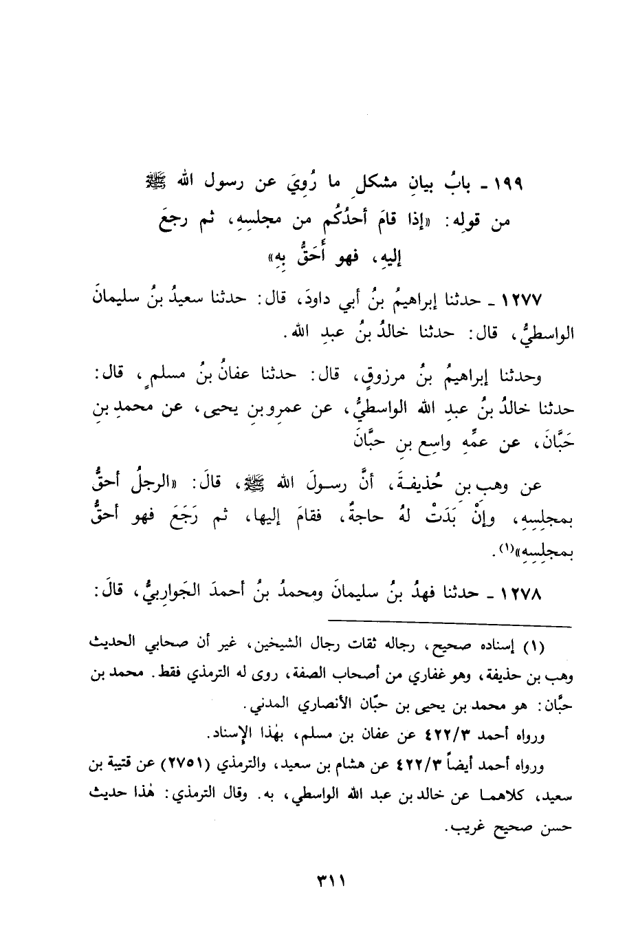1277 - حَدَّثَنَا إِبْرَاهِيمُ بْنُ أَبِي دَاوُدَ، قَالَ: حَدَّثَنَا سَعِيدُ بْنُ سُلَيْمَانَ الْوَاسِطِيُّ قَالَ: حَدَّثَنَا خَالِدُ بْنُ عَبْدِ اللهِ، وَحَدَّثَنَا إِبْرَاهِيمُ بْنُ مَرْزُوقٍ، قَالَ: حَدَّثَنَا عَفَّانَ بْنُ مُسْلِمٍ، قَالَ: حَدَّثَنَا خَالِدُ بْنُ عَبْدِ اللهِ الْوَاسِطِيُّ، عَنْ عَمْرِو بْنِ يَحْيَى، عَنْ مُحَمَّدِ بْنِ حَبَّانَ، عَنْ عَمِّهِ وَاسِعِ بْنِ حِبَّانَ، عَنْ وَهْبِ بْنِ حُذَيْفَةَ، أَنَّ رَسُولَ اللهِ صَلَّى اللَّهُ عَلَيْهِ وَسَلَّمَ قَالَ: " الرَّجُلُ أَحَقُّ بِمَجْلِسِهِ، وَإِنْ بَدَتْ لَهُ حَاجَةٌ فَقَامَ إلَيْهَا , ثُمَّ رَجَعَ فَهُوَ أَحَقُّ بِمَجْلِسِهِ "