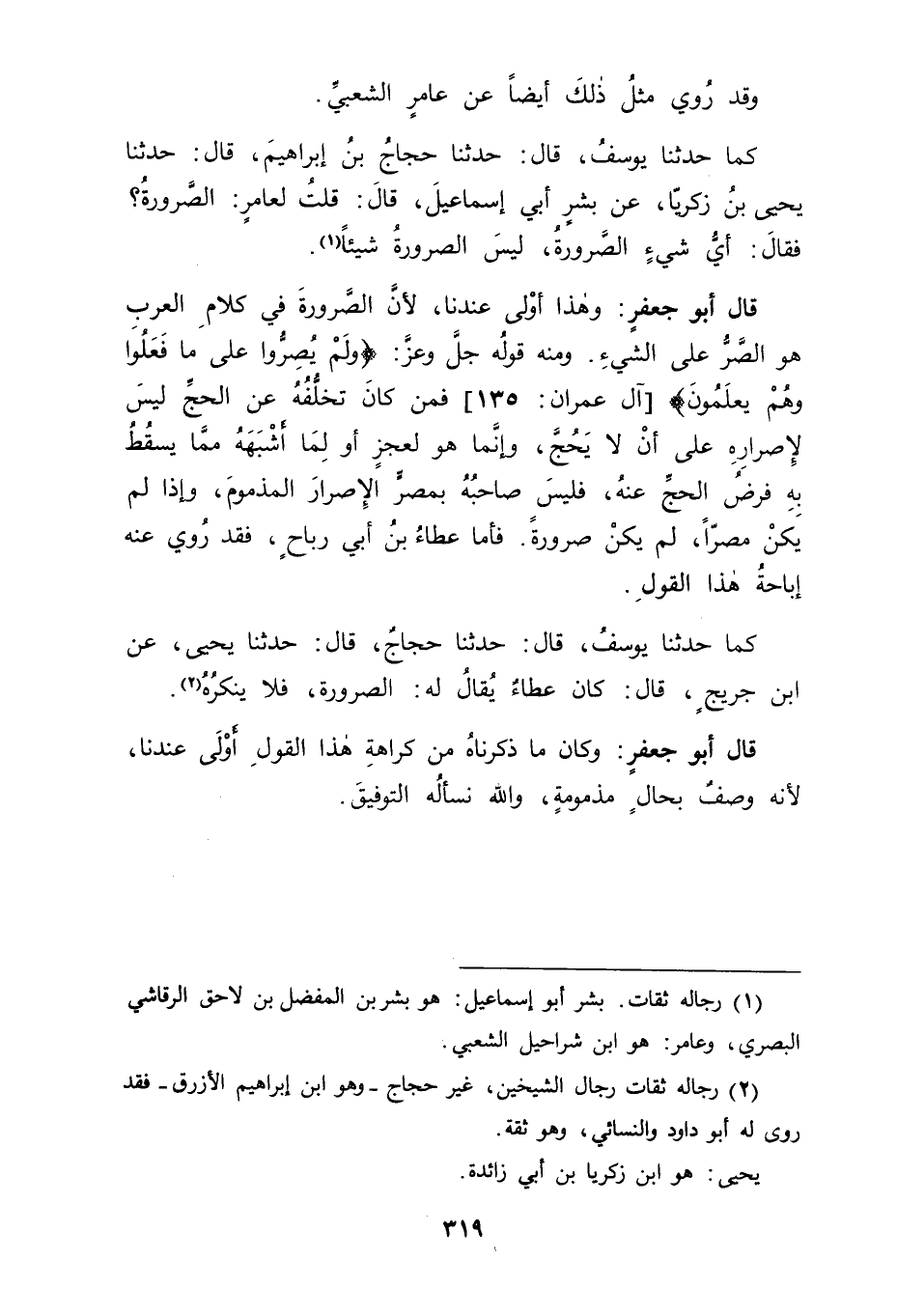 كَمَا حَدَّثَنَا يُوسُفُ، قَالَ: حَدَّثَنَا حَجَّاجُ بْنُ إِبْرَاهِيمَ قَالَ: حَدَّثَنَا يَحْيَى بْنُ زَكَرِيَّا عَنْ بِشْرٍ أَبِي إِسْمَاعِيلَ قَالَ: قُلْتُ لِعَامِرٍ: الصَّرُورَةُ؟ فَقَالَ: " أَيُّ شَيْءٍ الصَّرُورَةُ؟ لَيْسَ الصَّرُورَةُ شَيْئًا " قَالَ أَبُو جَعْفَرٍ: وَهَذَا أَوْلَى عِنْدَنَا ; لِأَنَّ الصَّرُورَةَ فِي كَلَامِ الْعَرَبِ هُوَ الصَّرُّ عَلَى الشَّيْءٍ، وَمِنْهُ قَوْلُ اللهِ جَلَّ وَعَزَّ: {وَلَمْ يُصِرُّوا عَلَى مَا فَعَلُوا وَهُمْ يَعْلَمُونَ} [آل عمران: 135] فَمَنْ كَانَ تَخَلُّفُهُ عَنِ الْحَجِّ لَيْسَ لِإِصْرَارِهِ عَلَى أَنْ لَا يَحُجَّ , وَإِنَّمَا هُوَ لِعَجْزٍ أَوْ لِمَا أَشْبَهَهُ مِمَّا يَسْقُطُ بِهِ فَرْضُ الْحَجِّ عَنْهُ , فَلَيْسَ صَاحِبُهُ بِمُصِرٍّ الْإِصْرَارَ الْمَذْمُومَ , وَإِذَا لَمْ يَكُنْ مُصِرًّا لَمْ يَكُنْ صَرُورَةً، فَأَمَّا عَطَاءُ بْنُ أَبِي رَبَاحٍ فَقَدْ رُوِيَ عَنْهُ إبَاحَةُ هَذَا الْقَوْلِ