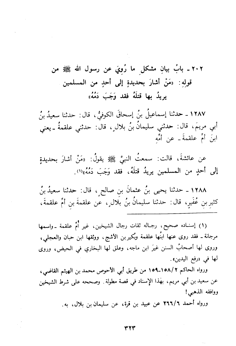1287 - حَدَّثَنَا إِسْمَاعِيلُ بْنُ إِسْحَاقَ الْكُوفِيُّ، قَالَ: حَدَّثَنَا سَعِيدُ بْنُ أَبِي مَرْيَمَ، قَالَ: حَدَّثَنِي سُلَيْمَانُ بْنُ بِلَالٍ، قَالَ: حَدَّثَنِي عَلْقَمَةُ، يَعْنِي: ابْنَ أُمِّ عَلْقَمَةَ عَنْ أُمِّهِ، عَنْ عَائِشَةَ قَالَتْ: سَمِعْتُ النَّبِيَّ صَلَّى اللَّهُ عَلَيْهِ وَسَلَّمَ يَقُولُ: " مَنْ أَشَارَ بِحَدِيدَةٍ إِلَى أَحَدٍ مِنَ الْمُسْلِمِينَ يُرِيدُ قَتْلَهُ فَقَدْ وَجَبَ دَمُهُ "