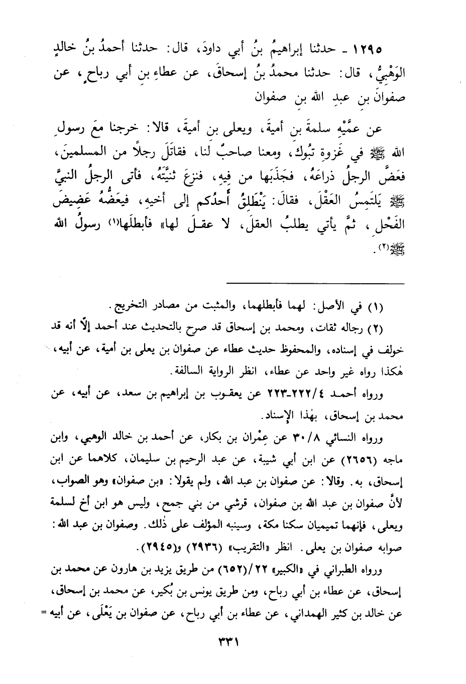 1295 - حَدَّثَنَا إِبْرَاهِيمُ بْنُ أَبِي دَاوُدَ قَالَ: حَدَّثَنَا أَحْمَدُ بْنُ خَالِدٍ الْوَهْبِيُّ قَالَ: حَدَّثَنَا مُحَمَّدُ بْنُ إِسْحَاقَ، عَنْ عَطَاءِ بْنِ أَبِي رَبَاحٍ، عَنْ صَفْوَانَ بْنِ عَبْدِ اللهِ بْنِ صَفْوَانَ، عَنْ عَمَّيْهِ سَلَمَةَ بْنِ أُمَيَّةَ، وَيَعْلَى بْنِ أُمَيَّةَ قَالَا: خَرَجْنَا مَعَ رَسُولِ اللهِ صَلَّى اللَّهُ عَلَيْهِ وَسَلَّمَ فِي غَزْوَةِ تَبُوكَ وَمَعَنَا صَاحِبٌ لَنَا , فَقَاتَلَ رَجُلًا مِنَ الْمُسْلِمِينَ، فَعَضَّ الرَّجُلُ ذِرَاعَهُ فَجَذَبَهَا مِنْ فِيهِ فَنَزَعَ ثَنِيَّتَهُ , فَأَتَى الرَّجُلُ النَّبِيَّ صَلَّى اللَّهُ عَلَيْهِ وَسَلَّمَ يَلْتَمِسُ الْعَقْلَ , فَقَالَ: " يَنْطَلِقُ أَحَدُكُمْ إِلَى أَخِيهِ فَيَعَضُّهُ عَضِيضَ الْفَحْلِ ثُمَّ يَأْتِي يَطْلُبُ الْعَقْلَ لَا عَقْلَ لَهَا " فَأَبْطَلَهَا رَسُولُ اللهِ صَلَّى اللَّهُ عَلَيْهِ وَسَلَّمَ. -[332]- قَالَ أَبُو جَعْفَرٍ: وَفِي حَدِيثِ ابْنِ إِسْحَاقَ هَذَا عَنْ عَطَاءٍ عَنْ صَفْوَانَ بْنِ عَبْدِ اللهِ بْنِ صَفْوَانَ وَهَذَا مِنَ الْخَطَأِ غَيْرُ مُشْكِلٍ ; لِأَنَّ صَفْوَانَ بْنَ عَبْدِ اللهِ بْنِ صَفْوَانَ رَجُلٌ مِنْ قُرَيْشٍ مِنْ بَنِي جُمَحَ، وَيَعْلَى صَاحِبُ هَذَا الْحَدِيثِ فَلَيْسَ مِنْ قُرَيْشٍ مِنْ أَنْفُسِهَا , وَإِنَّمَا هُوَ حَلِيفٌ لَهَا وَهُوَ رَجُلٌ مِنْ بَنِي تَمِيمٍ قَدِيمُ السُّكْنَى بِمَكَّةَ، ثُمَّ تَأَمَّلْنَا هَذَا الْحَدِيثَ بَعْدَ وُقُوفِنَا عَلَى اخْتِلَافِ أَهْلِ الْعِلْمِ فِي هَذِهِ الْجِنَايَةِ الْمَذْكُورَةِ فِيهِ , وَأَنَّ مِنْهُمْ مَنْ لَا يُبْطِلُ عَقْلَ ثَنِيَّتَيِ الْعَاضِّ عَنِ الْمَعْضُوضِ , مِنْهُمُ ابْنُ أَبِي لَيْلَى وَقَدْ ذَكَرْنَا فِي الْبَابِ الَّذِي قَبْلَ هَذَا الْبَابِ مِنْ أَحْوَالِ شَاهِرِ السِّلَاحِ مَا قَدْ ذَكَرْنَاهُ فِيهِ , وَأَنَّهُ إِنَّمَا حَلَّ لِلْمَشْهُورِ عَلَيْهِ دَمُ الشَّاهِرِ إِذْ كَانَ الشَّاهِرُ لَوْ تَمَّ مِنْهُ فِي الَّذِي شَهَرَ عَلَيْهِ السِّلَاحَ مَا شَهَرَهُ عَلَيْهِ مِنْ أَجْلِهِ، فَقَالَ قَائِلٌ: فَالْعَضُّ مِمَّا لَا قَوَدَ فِيهِ ; لِأَنَّهُ كَسْرٌ لِلْعَظْمِ الْمَعْضُوضِ. أَلَا تَرَى إِلَى قَوْلِ رَسُولِ اللهِ صَلَّى اللَّهُ عَلَيْهِ وَسَلَّمَ: " أَيَدَعُ يَدَهُ فِي فِيكَ فَتَقْضَمُهَا كَمَا يَقْضَمُ الْفَحْلُ " فَهَذَا دَلِيلٌ عَلَى أَنَّ فِيهَا كَسْرَ الْعَظْمِ , وَكَسْرُ الْعَظَامِ لَا قَوَدَ فِيهَا، فَكَانَ جَوَابُنَا لَهُ فِي ذَلِكَ بِتَوْفِيقِ اللهِ عَزَّ وَجَلَّ وَعَوْنِهِ: أَنَّ الْقَضْمَ الْمَذْكُورَ فِي هَذَا الْحَدِيثِ لَيْسَ هُوَ كَسْرُ الْعَظْمِ كَمَا تُوُهِّمَ ; لِأَنَّ الْقَضْمَ عِنْدَ الْعَرَبِ هُوَ الْقَضْمُ بِأَطْرَافِ الْأَسْنَانِ الَّذِي لَا يَبْلُغُ هَذَا , وَإِنَّمَا الَّذِي يَبْلُغُهُ عِنْدَهُمْ هُوَ الْخَضْمُ وَهُوَ التَّمَكُّنُ بِالْأَسْنَانِ كُلِّهَا فَذَلِكَ مِمَّا قَدْ -[333]- يَأْتِي عَلَى الْعَظْمِ، وَلَمَّا كَانَ مَا ذَكَرْنَا كَمَا وَصَفْنَا كَانَ الْقَضْمُ إِنَّمَا يَأْتِي عَلَى جِلْدَةِ الذِّرَاعِ أَوْ يَتَجَاوَزُهَا إِلَى اللَّحْمِ الَّذِي بَيْنَهَا وَبَيْنَ الْعَظْمِ، فَإِذَا تَجَاوَزَهَا إِلَى ذَلِكَ أَوْضَحَ الْعَظْمَ فَعَادَ مَعْنَاهُ فِي الذِّرَاعِ إِلَى مَعْنَى الْمُوضِحَةِ فِي الرَّأْسِ الَّتِي تُوضِحُ الْعَظْمَ , وَفِيهَا الْقَوَدُ بِاتِّفَاقِ الْمُسْلِمِينَ، فَمِثْلُهَا وُضُوحُ عَظْمِ الذِّرَاعِ فَفِيهِ الْقَوَدُ أَيْضًا , وَلَمَّا كَانَ فِيهِ الْقَوَدُ إِذَا تَمَّ ذَلِكَ الْعَقْلُ كَانَ لِلَّذِي قَصَدَ بِهِ إِلَيْهِ إزَالَتُهُ عَنْ نَفْسِهِ لِيَصِلَ بِذَلِكَ إِلَى الْوَاجِبِ لَهُ فِيمَا حَلَّ بِهِ مِنْهُ , وَلَوْ كَانَ الْعَاضُّ مَجْنُونًا أَوْ صَبِيًّا