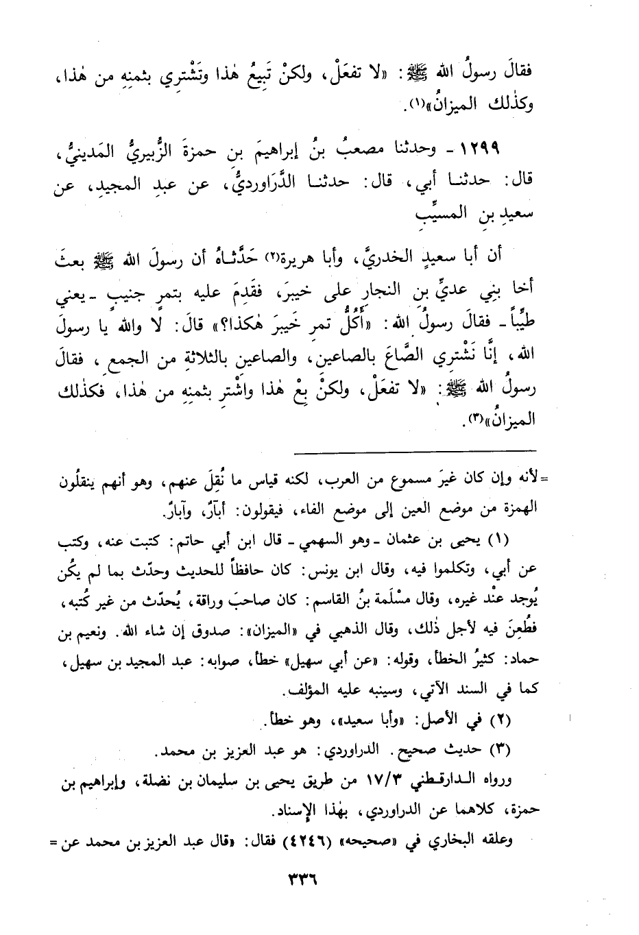 1299 - وَحَدَّثَنَا مُصْعَبُ بْنُ إِبْرَاهِيمَ بْنِ حَمْزَةَ الزُّبَيْرِيُّ الْمَدِينِيُّ، قَالَ: حَدَّثَنَا أَبِي، قَالَ: حَدَّثَنَا الدَّرَاوَرْدِيُّ، عَنْ عَبْدِ الْمَجِيدِ، عَنْ سَعِيدِ بْنِ الْمُسَيِّبِ، أَنَّ أَبَا سَعِيدٍ الْخُدْرِيِّ، وَأَبَا هُرَيْرَةَ حَدَّثَاهُ أَنَّ رَسُولَ اللهِ صَلَّى اللَّهُ عَلَيْهِ وَسَلَّمَ بَعَثَ أَخَا بَنِي عَدِيِّ بْنِ النَّجَّارِ عَلَى خَيْبَرَ فَقَدِمَ عَلَيْهِ بِتَمْرٍ جَنِيبٍ يَعْنِي: طَيِّبًا، فَقَالَ رَسُولُ اللهِ صَلَّى اللَّهُ عَلَيْهِ وَسَلَّمَ: " أَكُلُّ تَمْرِ خَيْبَرَ هَكَذَا؟ " قَالَ: لَا وَاللهِ يَا رَسُولَ اللهِ إِنَّا نَشْتَرِي الصَّاعَ بِالصَّاعَيْنِ، وَالصَّاعَيْنِ بِالثَّلَاثَةِ مِنَ الْجَمْعِ، فَقَالَ رَسُولُ اللهِ صَلَّى اللَّهُ عَلَيْهِ وَسَلَّمَ: " لَا تَفْعَلْ وَلَكِنْ بِعْ هَذَا وَاشْتَرِ بِثَمَنِهِ مِنْ هَذَا، فَكَذَلِكَ الْمِيزَانُ " -[337]-