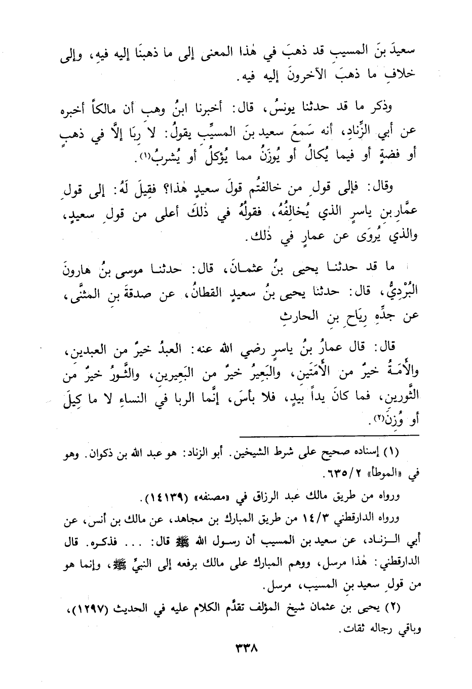 مَا قَدْ حَدَّثَنَا يَحْيَى بْنُ عُثْمَانَ، قَالَ: حَدَّثَنَا مُوسَى بْنُ هَارُونَ الْبَرْدِيُّ، قَالَ: حَدَّثَنَا يَحْيَى بْنُ سَعِيدٍ الْقَطَّانُ عَنْ صَدَقَةَ بْنِ الْمُثَنَّى عَنْ جَدِّهِ رِيَاحِ بْنِ الْحَارِثِ، قَالَ: قَالَ عَمَّارُ بْنُ يَاسِرٍ رَضِيَ اللهُ عَنْهُ: " الْعَبْدُ خَيْرٌ مِنَ الْعَبْدَيْنِ , وَالْأَمَةُ خَيْرٌ مِنَ الْأَمَتَيْنِ , وَالْبَعِيرُ خَيْرٌ مِنَ الْبَعِيرَيْنِ , وَالثَّوْرُ خَيْرٌ مِنَ الثَّوْرَيْنِ , فَمَا كَانَ يَدًا بِيَدٍ فَلَا بَأْسَ، إِنَّمَا الرِّبَا فِي النَّسَاءِ لَا مَا كِيلَ أَوْ وُزِنَ " -[339]- وَمَا قَدْ حَدَّثَنَا يَحْيَى بْنُ عُثْمَانَ قَالَ: حَدَّثَنَا أَصْبَغُ بْنُ الْفَرَجِ قَالَ: حَدَّثَنَا عِيسَى بْنُ يُونُسَ، عَنْ صَدَقَةَ بْنِ الْمُثَنَّى، عَنْ رِيَاحِ بْنِ الْحَارِثِ، عَنْ عَمَّارِ بْنِ يَاسِرٍ مِثْلَهُ إِلَّا أَنَّهُ لَمْ يَقُلْ: " وَالثَّوْرُ خَيْرٌ مِنَ الثَّوْرَيْنِ "، وَقَالَ مَكَانَ ذَلِكَ: " وَالثَّوْبُ خَيْرٌ مِنَ الثَّوْبَيْنِ " قَالَ أَبُو جَعْفَرٍ: فَلَمَّا كَانَ أَوْكَدَ الْأَشْيَاءِ فِي دُخُولِ الرِّبَا عَلَيْهَا الذَّهَبُ وَالْفِضَّةُ , وَلَيْسَا بِمَأْكُولَيْنِ وَلَا مَشْرُوبَيْنِ، عَقَلْنَا بِذَلِكَ أَنَّ الْعِلَّةَ الَّتِي لَهَا دُخُولُ الرِّبَا إِلَى الْوَزْنِ فِيمَا يُوزَنُ , وَالْكَيْلُ فِيمَا يُكَالُ مَأْكُولًا كَانَ ذَلِكَ أَوْ مَشْرُوبًا أَوْ غَيْرَ مَأْكُولٍ أَوْ مَشْرُوبٍ , وَاللهَ نَسْأَلُهُ التَّوْفِيقَ