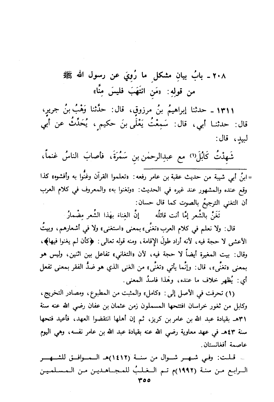 1311 - حَدَّثَنَا إِبْرَاهِيمُ بْنُ مَرْزُوقٍ، قَالَ: حَدَّثَنَا وَهْبُ بْنُ جَرِيرٍ، قَالَ: حَدَّثَنَا أَبِي، قَالَ: سَمِعْتُ يَعْلَى بْنَ حَكِيمٍ، يُحَدِّثُ عَنْ أَبِي لَبِيدٍ، قَالَ: شَهِدْتُ كَابُلَ مَعَ عَبْدِ الرَّحْمَنِ بْنِ سَمُرَةَ فَأَصَابَ النَّاسُ غَنَمًا -[356]- فَانْتَهَبُوهَا، فَقَالَ عَبْدُ الرَّحْمَنِ: مَنِ انْتَهَبَ مِنْ هَذَا الْغَنَمِ شَيْئًا فَلْيَرُدَّهُ؛ فَإِنِّي سَمِعْتُ رَسُولَ اللهِ صَلَّى اللَّهُ عَلَيْهِ وَسَلَّمَ يَقُولُ: " مَنِ انْتَهَبَ فَلَيْسَ مِنَّا "