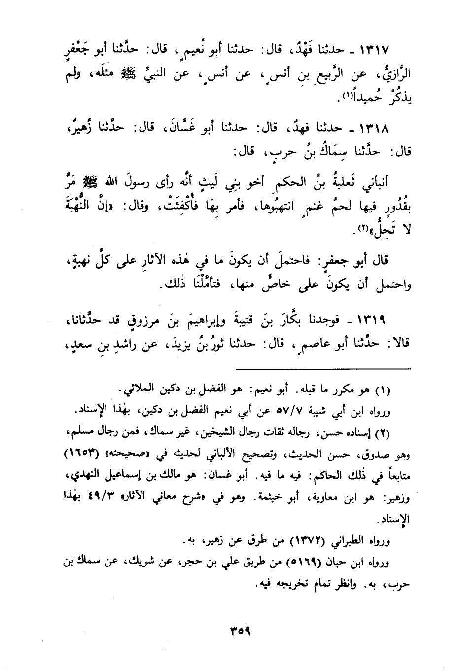 1318 - حَدَّثَنَا فَهْدٌ، قَالَ: حَدَّثَنَا أَبُو غَسَّانَ، قَالَ: حَدَّثَنَا زُهَيْرٌ، قَالَ: حَدَّثَنَا سِمَاكُ بْنُ حَرْبٍ، قَالَ: أَنْبَأَنِي ثَعْلَبَةُ بْنُ الْحَكَمِ أَخُو بَنِي لَيْثٍ أَنَّهُ رَأَى رَسُولَ اللهِ صَلَّى اللَّهُ عَلَيْهِ وَسَلَّمَ مَرَّ بِقُدُورٍ فِيهَا لَحْمُ غَنَمٍ انْتَهَبُوهَا فَأَمَرَ بِهَا فَأُكْفِئَتْ , وَقَالَ: " إِنَّ النُّهْبَةَ لَا تَحِلُّ " قَالَ أَبُو جَعْفَرٍ: فَاحْتُمِلَ أَنْ يَكُونَ مَا فِي هَذِهِ الْآثَارِ عَلَى كُلِّ نُهْبَةٍ , وَاحْتُمِلَ أَنْ يَكُونَ عَلَى خَاصٍّ مِنْهَا فَتَأَمَّلْنَا ذَلِكَ