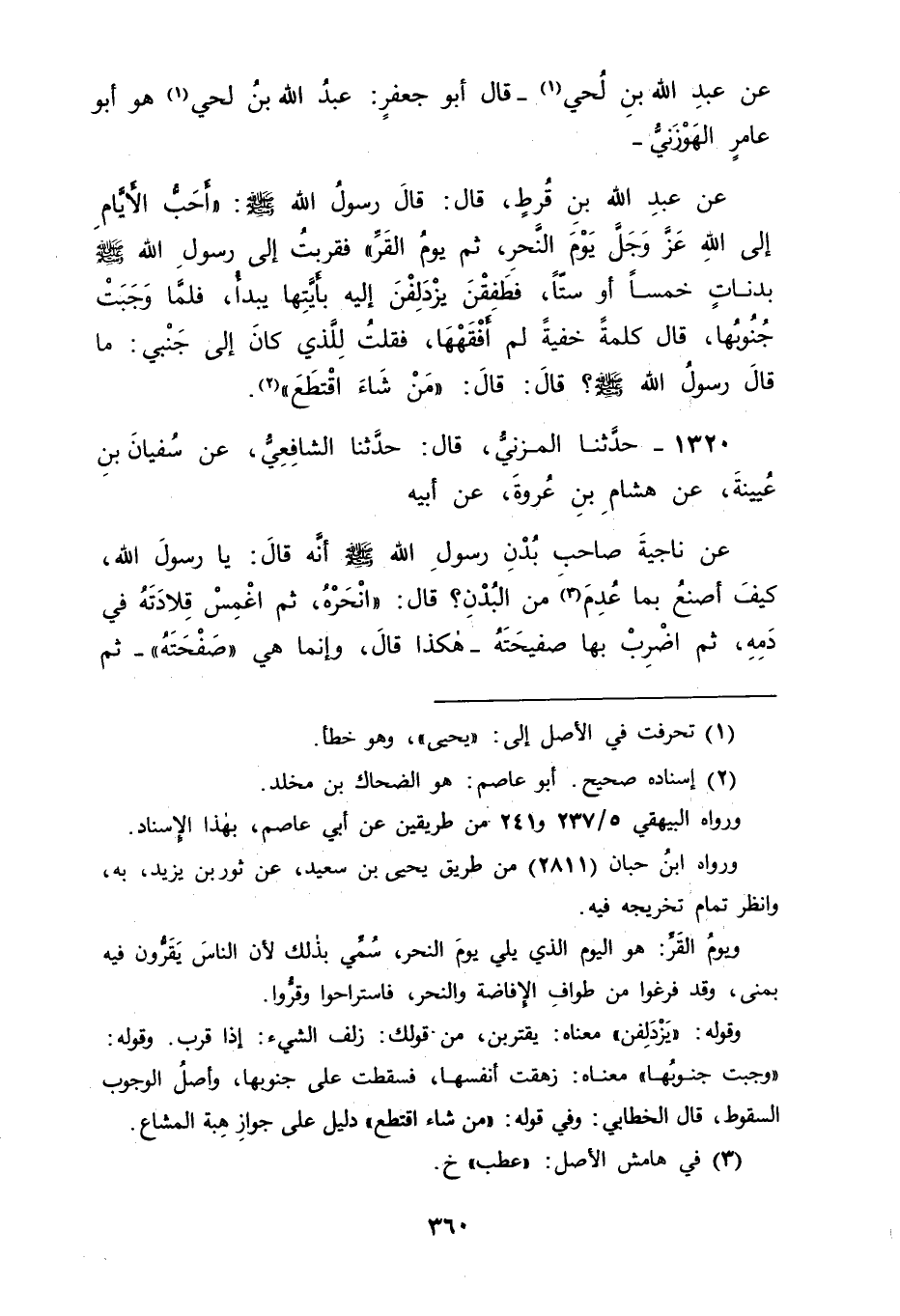 1320 - حَدَّثَنَا الْمُزَنِيُّ قَالَ: حَدَّثَنَا الشَّافِعِيُّ، عَنْ سُفْيَانَ بْنِ عُيَيْنَةَ، عَنْ هِشَامِ بْنِ عُرْوَةَ، عَنْ أَبِيهِ، عَنْ نَاجِيَةَ صَاحِبِ بُدْنِ رَسُولِ اللهِ صَلَّى اللَّهُ عَلَيْهِ وَسَلَّمَ أَنَّهُ قَالَ: يَا رَسُولَ اللهِ كَيْفَ أَصْنَعُ بِمَا عُدِمَ مِنَ الْبُدْنِ؟ قَالَ: " انْحَرْهُ ثُمَّ اغْمِسْ قِلَادَتَهُ فِي دَمِهِ , ثُمَّ اضْرِبْ بِهَا صَفِيحَتَهُ هَكَذَا قَالَ: وَإِنَّمَا هِيَ صَفْحَتُهُ ثُمَّ -[361]- خَلِّ بَيْنَهُ وَبَيْنَ النَّاسِ "