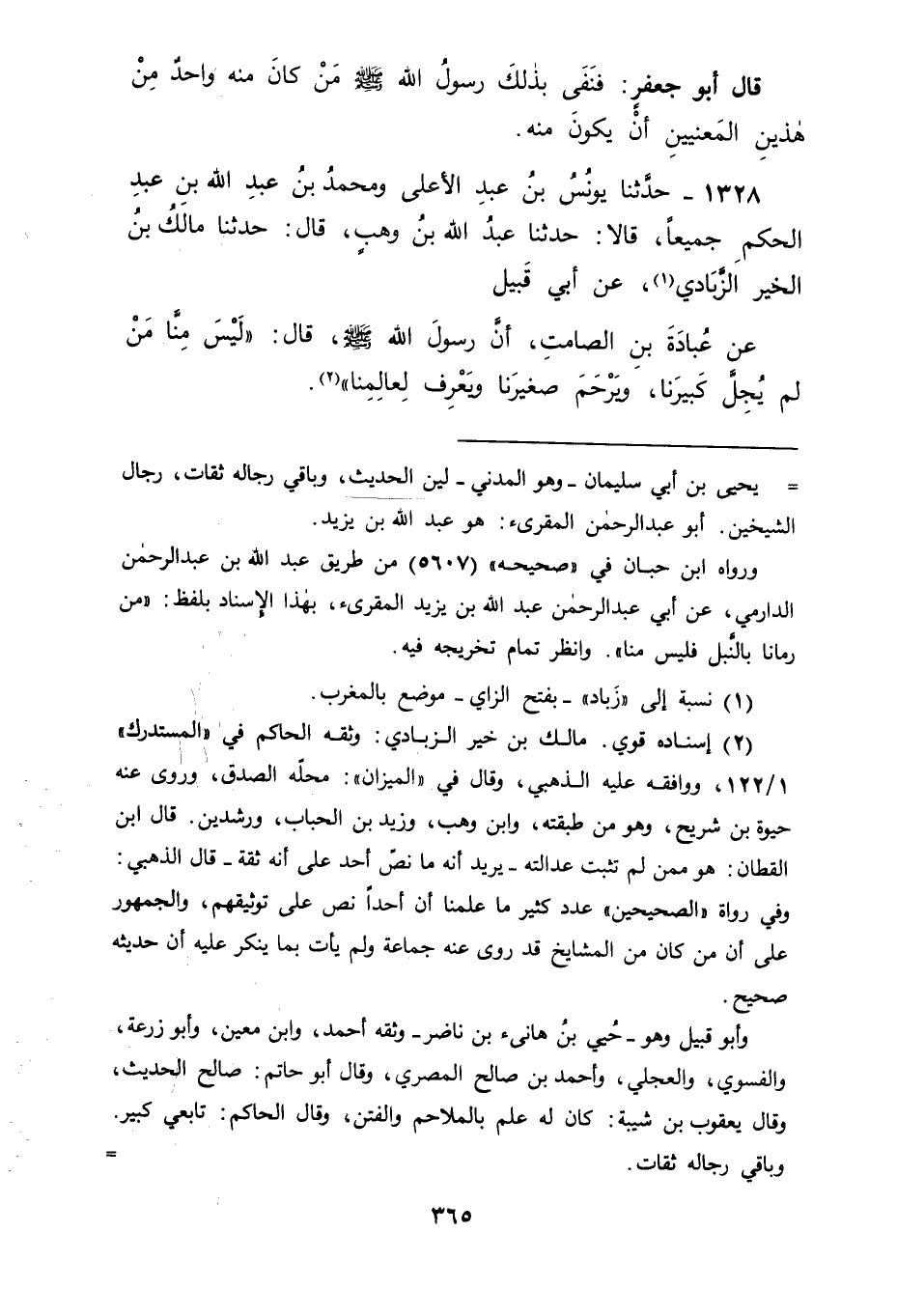1328 - حَدَّثَنَا يُونُسُ بْنُ عَبْدِ الْأَعْلَى، وَمُحَمَّدُ بْنُ عَبْدِ اللهِ بْنِ عَبْدِ الْحَكَمِ، قَالَا: حَدَّثَنَا عَبْدُ اللهِ بْنُ وَهْبٍ، قَالَ: حَدَّثَنَا مَالِكُ بْنُ الْخَيْرِ الزِّيَادِيُّ، عَنْ أَبِي قَبِيلٍ، عَنْ عُبَادَةَ بْنِ الصَّامِتِ أَنَّ رَسُولَ اللهِ صَلَّى اللَّهُ عَلَيْهِ وَسَلَّمَ قَالَ: " لَيْسَ مِنَّا مَنْ لَمْ يُجِلَّ كَبِيرَنَا وَيَرْحَمْ صَغِيرَنَا وَيَعْرِفْ لِعَالِمِنَا " -[366]- فَدَخَلَ مَا فِي هَذَا الْحَدِيثِ فِي مَعْنَى مَا رَوَيْنَاهُ قَبْلَهُ