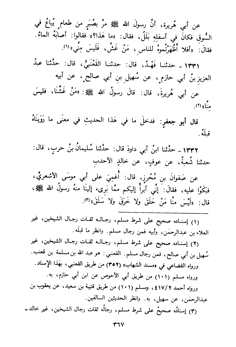 1331 - حَدَّثَنَا فَهْدٌ قَالَ: حَدَّثَنَا الْقَعْنَبِيُّ، قَالَ: حَدَّثَنَا عَبْدُ الْعَزِيزِ بْنُ أَبِي حَازِمٍ، عَنْ سُهَيْلِ بْنِ أَبِي صَالِحٍ، عَنْ أَبِيهِ، عَنْ أَبِي هُرَيْرَةَ قَالَ: قَالَ رَسُولُ اللهِ صَلَّى اللَّهُ عَلَيْهِ وَسَلَّمَ: " مَنْ غَشَّنَا فَلَيْسَ مِنَّا " قَالَ أَبُو جَعْفَرٍ: فَدَخَلَ مَا فِي هَذَا الْحَدِيثِ فِي مَعْنَى مَا رَوَيْنَاهُ قَبْلَهُ