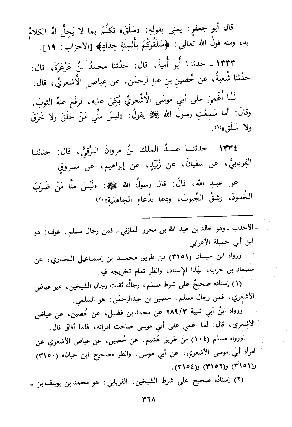 1333 - حَدَّثَنَا أَبُو أُمَيَّةَ، قَالَ: حَدَّثَنَا مُحَمَّدُ بْنُ عَرْعَرَةَ قَالَ: حَدَّثَنَا شُعْبَةُ، عَنْ حُصَيْنِ بْنِ عَبْدِ الرَّحْمَنِ، عَنْ عِيَاضٍ الْأَشْعَرِيِّ قَالَ: لَمَّا أُغْمِيَ عَلَى أَبِي مُوسَى الْأَشْعَرِيِّ بُكِيَ عَلَيْهِ , فَرَفَعَ عَنْهُ الثَّوْبَ، وَقَالَ: أَمَا سَمِعْتَ رَسُولَ اللهِ صَلَّى اللَّهُ عَلَيْهِ وَسَلَّمَ يَقُولُ: " لَيْسَ مِنِّي مَنْ حَلَقَ وَلَا خَرَقَ وَلَا سَلَقَ "