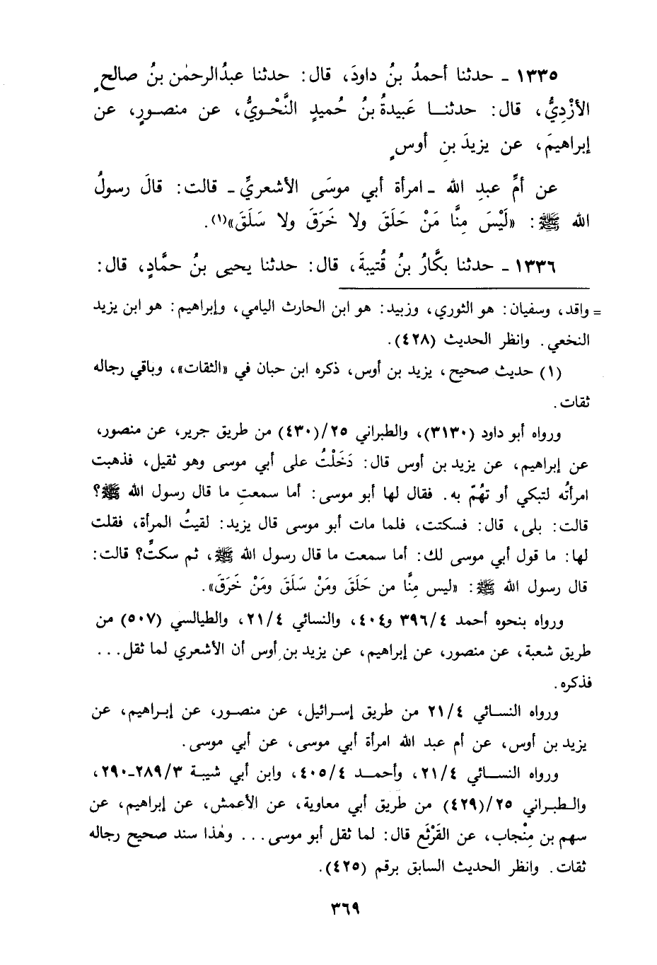 1335 - حَدَّثَنَا أَحْمَدُ بْنُ دَاوُدَ، قَالَ: حَدَّثَنَا عَبْدُ الرَّحْمَنِ بْنُ صَالِحٍ الْأَزْدِيُّ، قَالَ: حَدَّثَنَا عَبِيدَةُ بْنُ حُمَيْدٍ النَّحْوِيُّ، عَنْ مَنْصُورٍ، عَنْ إِبْرَاهِيمَ، عَنْ يَزِيدَ بْنِ أَوْسٍ، عَنْ أُمِّ عَبْدِ اللهِ، امْرَأَةِ أَبِي مُوسَى الْأَشْعَرِيِّ قَالَتْ: قَالَ رَسُولُ اللهِ صَلَّى اللَّهُ عَلَيْهِ وَسَلَّمَ: " لَيْسَ مِنَّا مَنْ حَلَقَ وَلَا خَرَقَ وَلَا سَلَقَ "