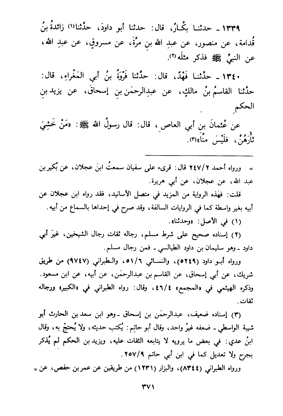 1340 - حَدَّثَنَا فَهْدٌ قَالَ: حَدَّثَنَا فَرْوَةُ بْنُ أَبِي الْمَغْرَاءِ، قَالَ: حَدَّثَنَا الْقَاسِمُ بْنُ مَالِكٍ، عَنْ عَبْدِ الرَّحْمَنِ بْنِ إِسْحَاقَ، عَنْ يَزِيدَ بْنِ الْحَكَمِ، عَنْ عُثْمَانَ بْنِ أَبِي الْعَاصِ قَالَ: قَالَ رَسُولُ اللهِ صَلَّى اللَّهُ عَلَيْهِ وَسَلَّمَ: " مَنْ خَشِيَ ثَأْرَهُنَّ فَلَيْسَ مِنَّا " -[372]- قَالَ أَبُو جَعْفَرٍ: فَدَخَلَ مَا فِي هَذَا الْحَدِيثِ فِي مَعْنَى مَا قَدْ ذَكَرْنَاهُ قَبْلَهُ