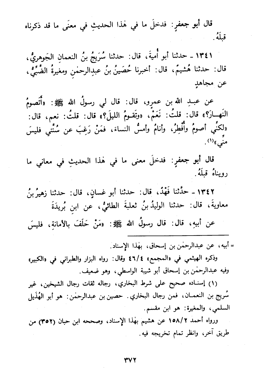 1341 - حَدَّثَنَا أَبُو أُمَيَّةَ، قَالَ: حَدَّثَنَا سُرَيْجُ بْنُ النُّعْمَانِ الْجَوْهَرِيُّ، قَالَ: حَدَّثَنَا هُشَيْمٌ، قَالَ: أَخْبَرَنَا حُصَيْنُ بْنُ عَبْدِ الرَّحْمَنِ، وَمُغِيرَةُ الضَّبِّيُّ، عَنْ مُجَاهِدٍ، عَنْ عَبْدِ اللهِ بْنِ عَمْرٍو، قَالَ: قَالَ لِي رَسُولُ اللهِ صَلَّى اللَّهُ عَلَيْهِ وَسَلَّمَ: " أَتَصُومُ النَّهَارَ؟ " قَالَ: قُلْتُ: نَعَمْ " وَتَقُومُ اللَّيْلَ؟ " قَالَ: قُلْتُ: نَعَمْ. قَالَ: " لَكِنِّي أَصُومُ وَأُفْطِرُ، وَأَنَامُ وَأَمَسُّ النِّسَاءَ، فَمَنْ رَغِبَ عَنْ سُنَّتِي فَلَيْسَ مِنِّي " قَالَ أَبُو جَعْفَرٍ: فَدَخَلَ مَعْنَى مَا فِي هَذَا الْحَدِيثِ فِي مَعَانِي مَا رَوَيْنَاهُ قَبْلَهُ