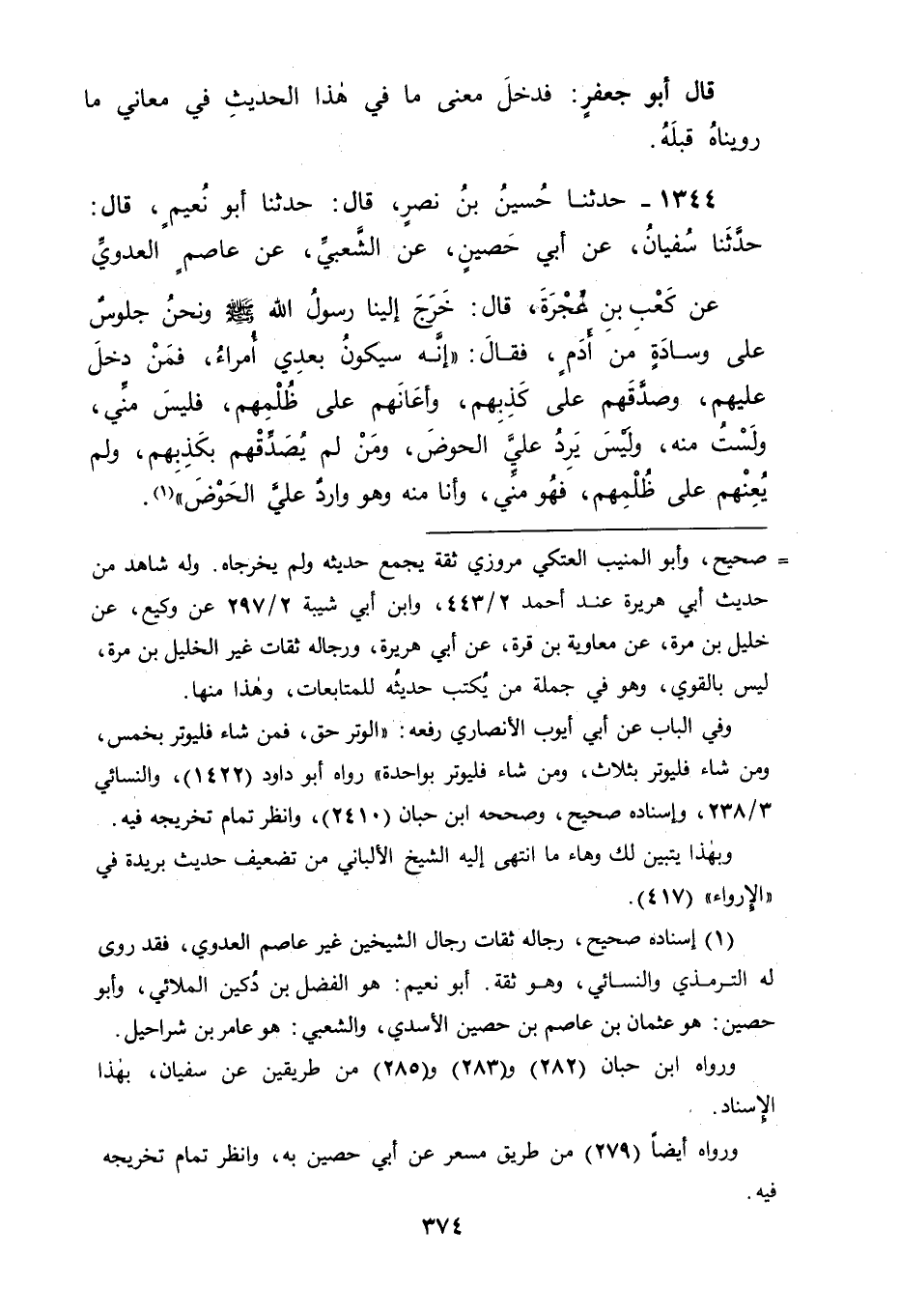1344 - حَدَّثَنَا حُسَيْنُ بْنُ نَصْرٍ، قَالَ: حَدَّثَنَا أَبُو نُعَيْمٍ قَالَ: حَدَّثَنَا سُفْيَانُ، عَنْ أَبِي حُصَيْنٍ، عَنِ الشَّعْبِيِّ، عَنْ عَاصِمٍ الْعَدَوِيِّ، عَنْ كَعْبِ بْنِ عُجْرَةَ قَالَ: خَرَجَ إلَيْنَا رَسُولُ اللهِ صَلَّى اللَّهُ عَلَيْهِ وَسَلَّمَ وَنَحْنُ جُلُوسٌ عَلَى وِسَادَةٍ مِنْ أَدَمٍ فَقَالَ: " إِنَّهُ سَيَكُونُ بَعْدِي أُمَرَاءُ، فَمَنْ دَخَلَ عَلَيْهِمْ وَصَدَّقَهُمْ عَلَى كَذِبِهِمْ , وَأَعَانَهُمْ عَلَى ظُلْمِهِمْ فَلَيْسَ مِنِّي وَلَسْتُ مِنْهُ وَلَيْسَ يَرِدُ عَلَيَّ الْحَوْضَ , وَمَنْ لَمْ يُصَدِّقْهُمْ بِكَذِبِهِمْ وَلَمْ يُعِنْهُمْ عَلَى ظُلْمِهِمْ فَهُوَ مِنِّي وَأَنَا مِنْهُ، وَهُوَ وَارِدٌ عَلَيَّ الْحَوْضَ "