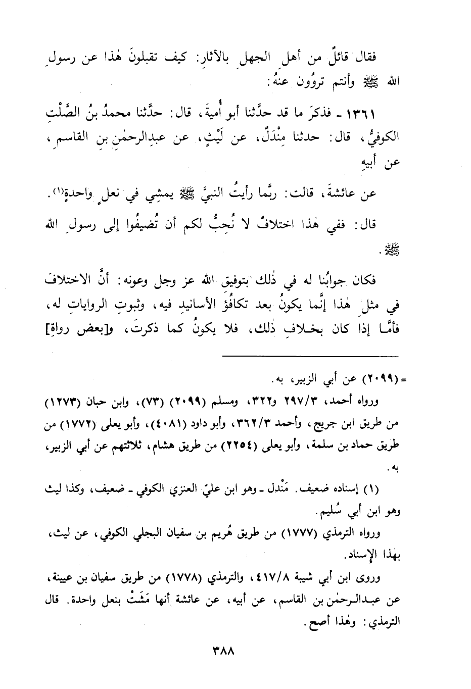 1361 - فَذَكَرَ مَا قَدْ حَدَّثَنَا أَبُو أُمَيَّةَ، قَالَ: حَدَّثَنَا مُحَمَّدُ بْنُ الصَّلْتِ الْكُوفِيُّ، قَالَ: حَدَّثَنَا مِنْدَلٌ، عَنْ لَيْثٍ، عَنْ عَبْدِ الرَّحْمَنِ بْنِ الْقَاسِمِ، عَنْ أَبِيهِ، عَنْ عَائِشَةَ قَالَتْ: " رُبَّمَا رَأَيْتُ النَّبِيَّ صَلَّى اللَّهُ عَلَيْهِ وَسَلَّمَ يَمْشِي فِي نَعْلٍ وَاحِدَةٍ " قَالَ: فَفِي هَذَا اخْتِلَافٌ، لَا نُحِبُّ لَكُمْ أَنْ تُضِيفُوا إِلَى رَسُولِ اللهِ صَلَّى اللَّهُ عَلَيْهِ وَسَلَّمَ. فَكَانَ جَوَابُنَا لَهُ فِي ذَلِكَ بِتَوْفِيقِ اللهِ عَزَّ وَجَلَّ وَعَوْنِهِ: أَنَّ الِاخْتِلَافَ فِي مِثْلِ هَذَا إِنَّمَا يَكُونُ بَعْدَ تَكَافُؤِ الْأَسَانِيدِ فِيهِ , وَثُبُوتِ الرِّوَايَاتِ لَهُ، فَأَمَّا إِذَا كَانَ بِخِلَافِ ذَلِكَ فَلَا يَكُونُ كَمَا ذَكَرْتَ , وَبَعْضُ رُوَاةِ -[389]- الْحَدِيثِ فِي هَذِهِ الرِّوَايَةِ لَيْسَ مِمَّنْ يُحْتَجُّ بِهِ فِيهَا وَلَا مِمَّنْ يَجُوزُ أَنْ يُعَارِضَ بِمَا رَوَى مَا رَوَاهُ الَّذِي ذَكَرْتُهُ عَنْ عَائِشَةَ، فَإِنَّمَا هُوَ مِنْ حَدِيثِ مِنْدَلٍ وَلَيْسَ مِنْ أَهْلِ الثَّبْتِ مِمَّنْ ذَكَرْنَا قَبْلَهُ فِي الْفَصْلِ الْأَوَّلِ مِنْ هَذَا الْبَابِ لَا سِيَّمَا , وَإِنَّمَا رَوَى مَا ذَكَرْتَ عَنْ لَيْثِ بْنِ أَبِي سُلَيْمٍ وَهُوَ أَيْضًا وَإِنْ كَانَ مِنْ أَهْلِ الْفَضْلِ فَإِنَّ رِوَايَتَهُ لَيْسَتْ عِنْدَ أَهْلِ الْعِلْمِ بِالْأَسَانِيدِ الْقَوِيَّةِ , وَالَّذِي ثَبَتَ عَنْ رَسُولِ اللهِ صَلَّى اللَّهُ عَلَيْهِ وَسَلَّمَ مِمَّا يُخَالِفُهَا عَنْ جَابِرٍ وَعَنْ أَبِي هُرَيْرَةَ هُوَ أَحْسَنُ مِنْ لِبَاسِ النَّاسِ ; لِأَنَّ مَنْ لَبِسَ نَعْلًا وَاحِدَةً، أَوْ خُفًّا وَاحِدًا كَانَ بِذَلِكَ عِنْدَ النَّاسِ سَخِيفًا وَسَخِرُوا مِنْهُ , فَمِثْلُ هَذَا لَوْ لَمْ يَكُنْ فِيهِ نَهْيٌ وَجَبَ أَنْ يُنْتَهَى عَنْهُ , وَاللهَ نَسْأَلُهُ التَّوْفِيقَ