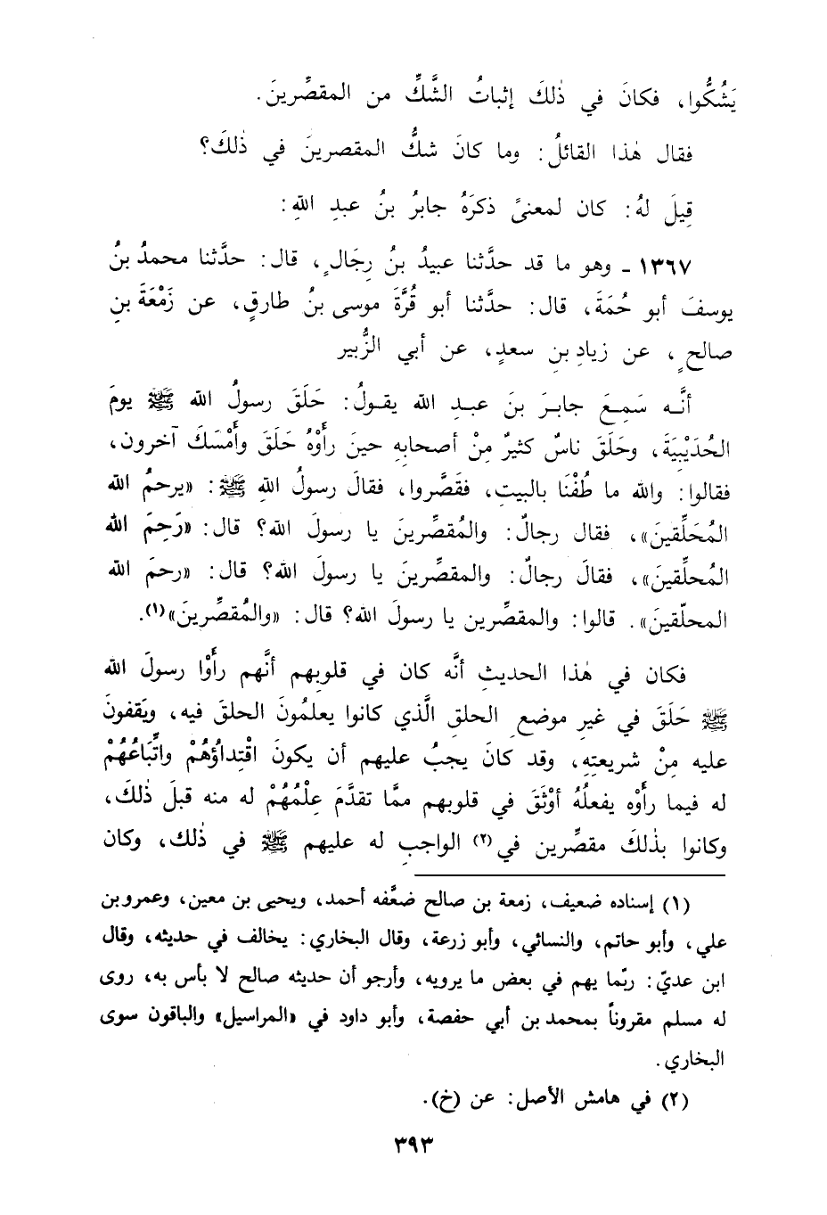 1367 - وَهُوَ مَا قَدْ حَدَّثَنَا عُبَيْدُ بْنُ رِجَالٍ، قَالَ: حَدَّثَنَا مُحَمَّدُ بْنُ يُوسُفَ أَبُو حُمَّةَ، قَالَ: حَدَّثَنَا أَبُو قُرَّةَ مُوسَى بْنُ طَارِقٍ عَنْ زَمْعَةَ بْنِ صَالِحٍ، عَنْ زِيَادِ بْنِ سَعْدٍ، عَنْ أَبِي الزُّبَيْرِ، أَنَّهُ سَمِعَ جَابِرَ بْنَ عَبْدِ اللهِ، يَقُولُ: حَلَقَ رَسُولُ اللهِ صَلَّى اللَّهُ عَلَيْهِ وَسَلَّمَ يَوْمَ الْحُدَيْبِيَةِ وَحَلَقَ نَاسٌ كَثِيرٌ مِنْ أَصْحَابِهِ حِينَ رَأَوْهُ حَلَقَ , وَأَمْسَكَ آخَرُونَ فَقَالُوا: وَاللهِ مَا طُفْنَا بِالْبَيْتِ فَقَصَّرُوا. فَقَالَ رَسُولُ اللهِ صَلَّى اللَّهُ عَلَيْهِ وَسَلَّمَ: " يَرْحَمُ اللهُ الْمُحَلِّقِينَ " , فَقَالَ رِجَالٌ: وَالْمُقَصِّرِينَ يَا رَسُولَ اللهِ؟ قَالَ: " رَحِمَ اللهُ الْمُحَلِّقِينَ " فَقَالَ رِجَالٌ: وَالْمُقَصِّرِينَ يَا رَسُولَ اللهِ؟ قَالَ: " رَحِمَ اللهُ الْمُحَلِّقِينَ " قَالُوا: وَالْمُقَصِّرِينَ يَا رَسُولَ اللهِ؟ قَالَ: " وَالْمُقَصِّرِينَ " فَكَانَ فِي هَذَا الْحَدِيثِ أَنَّهُ كَانَ فِي قُلُوبِهِمْ أَنَّهُمْ رَأَوْا رَسُولَ اللهِ صَلَّى اللَّهُ عَلَيْهِ وَسَلَّمَ حَلَقَ فِي غَيْرِ مَوْضِعِ الْحَلْقِ الَّذِي كَانُوا يَعْلَمُونَ الْحَلْقَ فِيهِ وَيَقِفُونَ عَلَيْهِ مِنْ شَرِيعَتِهِ , وَقَدْ كَانَ يَجِبُ عَلَيْهِمْ أَنْ يَكُونَ اقْتِدَاؤُهُمْ وَاتِّبَاعُهُمْ لَهُ فِيمَا رَأَوْهُ يَفْعَلُهُ أَوْثَقَ فِي قُلُوبِهِمْ مِمَّا تَقَدَّمَ عِلْمُهُمْ لَهُ مِنْهُ قَبْلَ ذَلِكَ , وَكَانُوا بِذَلِكَ مُقَصِّرِينَ فِي الْوَاجِبِ لَهُ عَلَيْهِمْ صَلَّى اللَّهُ عَلَيْهِ وَسَلَّمَ فِي ذَلِكَ , وَكَانَ -[394]- الْحَالِقُونَ فَاعِلِينَ لِمَا يَجِبُ عَلَيْهِمْ مِنَ امْتِثَالِ فِعْلِهِ , وَتَرْكِ التَّخَلُّفِ عَنِ الْقُدْوَةِ بِهِ فَفَضَلُوا بِذَلِكَ مَنْ تَخَلَّفَ عَنْ مِثْلِهِ لَا لِفَضْلٍ فِي الْحَلْقِ عَلَى التَّقْصِيرِ وَلَكِنْ ; لِأَنَّ السَّبْقَ إِلَى الْمَعْرِفَةِ لِلْأَشْيَاءِ يُوجِبُ الْفَضِيلَةَ لِلسَّابِقِينَ إلَيْهَا كَمَا وَجَبَ لِأَبِي بَكْرٍ رَضِيَ اللهُ عَنْهُ بِسَبْقِهِ النَّاسَ إِلَى تَصْدِيقِهِ رَسُولَ اللهِ صَلَّى اللَّهُ عَلَيْهِ وَسَلَّمَ عَلَى إتْيَانِهِ بَيْتَ الْمَقْدِسِ مِنْ مَكَّةَ وَرُجُوعِهِ مِنْهُ إِلَى مَنْزِلِهِ بِمَكَّةَ فِي تِلْكَ اللَّيْلَةِ حَتَّى سُمِّيَ بِذَلِكَ الصِّدِّيقَ، وَإِنْ كَانَ -[395]- الْمُؤْمِنُونَ جَمِيعًا يَشْهَدُونَ لِرَسُولِ اللهِ صَلَّى اللَّهُ عَلَيْهِ وَسَلَّمَ بِمِثْلِ ذَلِكَ إِذَا وَقَفُوا عَلَيْهِ. وَكَمَا اسْتَحَقَّ خُزَيْمَةُ بْنُ ثَابِتٍ الْأَنْصَارِيُّ أَنْ جُعِلَتْ شَهَادَتُهُ شَهَادَةَ رَجُلَيْنِ لَمَّا شَهِدَ لِرَسُولِ اللهِ صَلَّى اللَّهُ عَلَيْهِ وَسَلَّمَ عَلَى الْأَعْرَابِيِّ أَنَّهُ بَايَعَهُ الْبَعِيرَ الَّذِي كَانَ رَسُولُ اللهِ صَلَّى اللَّهُ عَلَيْهِ وَسَلَّمَ ابْتَاعَهُ مِنْهُ عِنْدَ جُحُودِ الْأَعْرَابِيِّ ذَلِكَ وَعِنْدَ قَوْلِهِ لَهُ: هَلُمَّ شَهِيدًا يَشْهَدُ لَكَ فَلَمَّا شَهِدَ لَهُ خُزَيْمَةُ بِمَا شَهِدَ لَهُ بِهِ قَالَ لَهُ رَسُولُ اللهِ صَلَّى اللَّهُ عَلَيْهِ وَسَلَّمَ: " كَيْفَ شَهِدْتَ وَلَمْ تَكُنْ مَعَنَا؟ " قَالَ: شَهِدْتُ بِتَصْدِيقِكَ، فَجَعَلَ رَسُولُ اللهِ صَلَّى اللَّهُ عَلَيْهِ وَسَلَّمَ بِذَلِكَ شَهَادَتَهُ بِشَهَادَةِ رَجُلَيْنِ. وَسَنَذْكُرُ هَذَا الْحَدِيثَ بِإِسْنَادِهِ فِيمَا بَعْدُ مِنْ كِتَابِنَا هَذَا إِنْ شَاءَ اللهُ وَالنَّاسُ جَمِيعًا يَشْهَدُونَ بِصِدْقِ رَسُولِ اللهِ صَلَّى اللَّهُ عَلَيْهِ وَسَلَّمَ، وَلَكِنَّ خُزَيْمَةَ لَمَّا سَبَقَهُمْ إِلَى ذَلِكَ اسْتَحَقَّ الْفَضِيلَةَ عَلَيْهِمْ فِيهِ، فَمِثْلُ ذَلِكَ الْمُحَلِّقُونَ اسْتَحَقُّوا الْفَضِيلَةَ عَلَى الْ