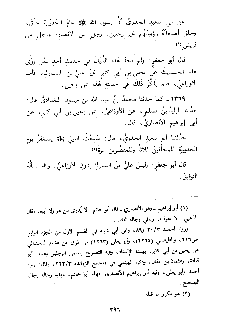 1369 - كَمَا حَدَّثَنَا مُحَمَّدُ بْنُ عَبْدِ اللهِ بْنِ مَيْمُونٍ الْبَغْدَادِيُّ، قَالَ: حَدَّثَنَا الْوَلِيدُ بْنُ مُسْلِمٍ، عَنِ الْأَوْزَاعِيِّ، عَنْ يَحْيَى بْنِ أَبِي كَثِيرٍ، عَنْ أَبِي إِبْرَاهِيمَ الْأَنْصَارِيِّ، قَالَ: حَدَّثَنَا أَبُو سَعِيدٍ الْخُدْرِيِّ قَالَ: " سَمِعْتُ النَّبِيَّ صَلَّى اللَّهُ عَلَيْهِ وَسَلَّمَ يَسْتَغْفِرُ يَوْمَ الْحُدَيْبِيَةِ لِلْمُحَلِّقِينَ ثَلَاثًا وَلِلْمُقَصِّرِينَ مَرَّةً " قَالَ أَبُو جَعْفَرٍ: وَلَيْسَ عَلِيُّ بْنُ الْمُبَارَكِ بِدُونِ الْأَوْزَاعِيِّ , وَاللهَ نَسْأَلُهُ التَّوْفِيقَ