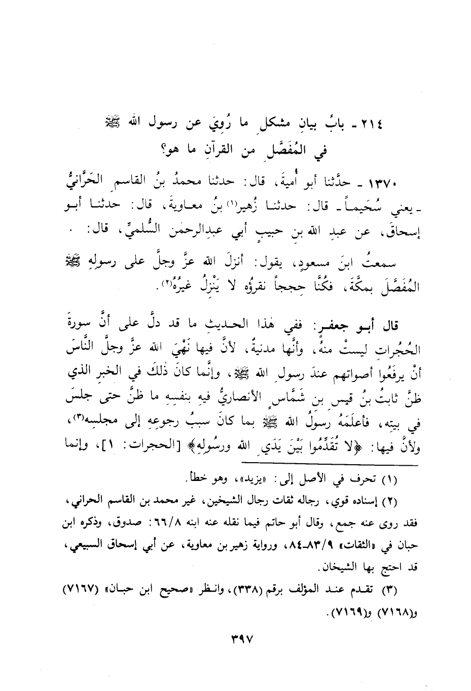 1370 - حَدَّثَنَا أَبُو أُمَيَّةَ، قَالَ: حَدَّثَنَا مُحَمَّدُ بْنُ الْقَاسِمِ الْحَرَّانِيُّ يَعْنِي سُحَيْمًا، قَالَ: حَدَّثَنَا زُهَيْرُ بْنُ مُعَاوِيَةَ، قَالَ: حَدَّثَنَا أَبُو إِسْحَاقَ، عَنْ عَبْدِ اللهِ بْنِ حَبِيبٍ أَبِي عَبْدِ الرَّحْمَنِ السُّلَمِيِّ، قَالَ: سَمِعْتُ ابْنَ مَسْعُودٍ يَقُولُ: " أَنْزَلَ اللهُ عَزَّ وَجَلَّ عَلَى رَسُولِهِ صَلَّى اللَّهُ عَلَيْهِ وَسَلَّمَ الْمُفَصَّلَ بِمَكَّةَ فَكُنَّا حِجَجًا نَقْرَؤُهُ لَا يَنْزِلُ غَيْرُهُ " قَالَ أَبُو جَعْفَرٍ: فَفِي هَذَا الْحَدِيثِ مَا قَدْ دَلَّ عَلَى أَنَّ سُورَةَ الْحُجُرَاتِ لَيْسَتْ مِنْهُ , وَأَنَّهَا مَدَنِيَّةٌ ; لِأَنَّ فِيهَا نَهْيَ اللهِ عَزَّ وَجَلَّ النَّاسَ أَنْ يَرْفَعُوا أَصْوَاتَهُمْ عِنْدَ رَسُولِ اللهِ صَلَّى اللَّهُ عَلَيْهِ وَسَلَّمَ , وَإِنَّمَا كَانَ ذَلِكَ فِي الْخَبَرِ الَّذِي ظَنَّ ثَابِتُ بْنُ قَيْسِ بْنِ شِمَاسٍ الْأَنْصَارِيُّ فِيهِ بِنَفْسِهِ مَا ظَنَّ حَتَّى جَلَسَ فِي بَيْتِهِ، فَأَعْلَمَهُ رَسُولُ اللهِ صَلَّى اللَّهُ عَلَيْهِ وَسَلَّمَ بِمَا كَانَ سَبَبَ رُجُوعِهِ إِلَى مَجْلِسِهِ ; وَلِأَنَّ فِيهَا: {لَا تُقَدِّمُوا بَيْنَ يَدَيِ اللهِ وَرَسُولِهِ} [الحجرات: 1] وَإِنَّمَا -[398]- كَانَ سَبَبُ نُزُولِ ذَلِكَ عَلَيْهِ صَلَّى اللَّهُ عَلَيْهِ وَسَلَّمَ لِمَا كَانَ مِنْ أَبِي بَكْرٍ وَعُمَرَ مِنْ مَشُورَةِ كُلِّ وَاحِدٍ مِنْهُمَا عَلَيْهِ بِتَوْلِيَةِ مَنْ أَشَارَ عَلَيْهِ بِتَوْلِيَتِهِ مِنَ الْأَقْرَعِ بْنِ حَابِسٍ وَمِنَ الْقَعْقَاعِ وَمِنْ مَعْبَدِ بْنِ زُرَارَةَ , وَقَدْ ذَكَرْنَا ذَلِكَ وَمَا رُوِيَ فِيهِ فِيمَا تَقَدَّمَ مِنْ كِتَابِنَا هَذَا ; وَلِأَنَّ فِيهَا {إِنْ جَاءَكُمْ فَاسِقٌ بِنَبَأٍ فَتَبَيَّنُوا} [الحجرات: 6] الْآيَةَ , فَكَانَ سَبَبُ نُزُولِ ذَلِكَ فِي الَّذِي بَعَثَهُ رَسُولُ اللهِ صَلَّى اللَّهُ عَلَيْهِ وَسَلَّمَ مُصَّدِّقًا إِلَى قَوْمٍ فَأَقْبَلُوا إِلَيْهِ لِيُكْرِمُوهُ فَلَمَّا رَآهُمْ مُقْبِلِينَ نَحْوَهُ أَدْبَرَ هَارِبًا إِلَى رَسُولِ اللهِ صَلَّى اللَّهُ عَلَيْهِ وَسَلَّمَ فَأَخْبَرَهُ عَنْهُمْ بِخِلَافِ ذَلِكَ , وَجَاءُوا مِنْ بَعْدُ إِلَى رَسُولِ اللهِ صَلَّى اللَّهُ عَلَيْهِ وَسَلَّمَ فَأَخْبَرُوهُ بِحَقِيقَةِ أَمْرِهِمْ، وَأَنْزَلَ اللهُ تَصْدِيقَهُمْ عَلَيْهِ، وَرَسُولُ اللهِ صَلَّى اللَّهُ عَلَيْهِ وَسَلَّمَ فَلَمْ يُوَلِّ أَحَدًا وَلَمْ يَبْعَثْ مُصَّدِّقًا وَهُوَ بِمَكَّةَ، وَإِنَّمَا كَانَ ذَلِكَ مِنْهُ وَهُوَ بِالْمَدِينَةِ ; وَلِأَنَّ فِيهَا {وَإِنْ طَائِفَتَانِ مِنَ الْمُؤْمِنِينَ اقْتَتَلُوا فَأَصْلِحُوا بَيْنَهُمَا} [الحجرات: 9] الْآيَةَ , وَإِنَّمَا كَانَ ذَلِكَ لِسَبَبٍ كَانَ بَيْنَ الْأَنْصَارِ حَتَّى تَحَارَبُوا مِنْ أَجْلِهِ -[399]- بِمَا تَحَارَبُوا بِهِ، فَأَنْزَلَ اللهُ عَزَّ وَجَلَّ هَذِهِ فِي ذَلِكَ , وَسَنَذْكُرُ ذَلِكَ بِإِسْنَادِهِ فِيمَا بَعْدُ مِنْ كِتَابِنَا هَذَا إِنْ شَاءَ اللهُ. وَإِذَا انْتَفَى أَنْ تَكُونَ الْحُجُرَاتُ مِنَ الْمُفَصَّلِ لِمَا قَدْ ذَكَرْنَا ; وَلِأَنَّ الْحُجُرَاتِ لَمْ تَكُنْ إِلَّا بِالْمَدِينَةِ كَانَ أَوَّلُهُ قَافٌ ثُمَّ نَظَرْنَا إِلَى مَا يَدُلُّ عَلَى ذَلِكَ سِوَى هَذَا الْحَدِيثِ