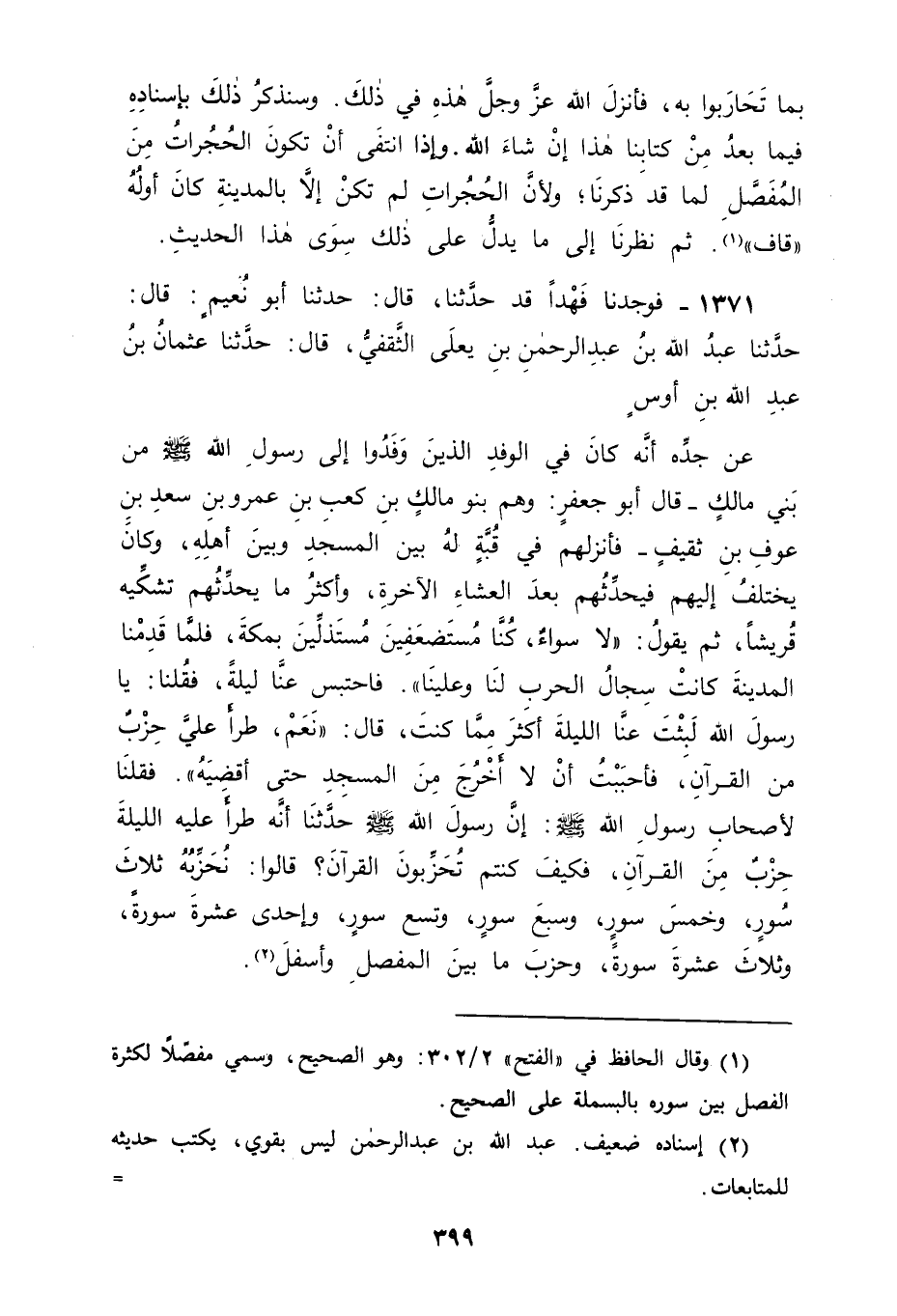 1371 - فَوَجَدْنَا فَهْدًا قَدْ حَدَّثَنَا قَالَ: حَدَّثَنَا أَبُو نُعَيْمٍ، قَالَ: حَدَّثَنَا عَبْدُ اللهِ بْنُ عَبْدِ الرَّحْمَنِ بْنِ يَعْلَى الثَّقَفِيُّ، قَالَ: حَدَّثَنَا عُثْمَانُ بْنُ عَبْدِ اللهِ بْنِ أَوْسٍ، عَنْ جَدِّهِ، أَنَّهُ كَانَ فِي الْوَفْدِ الَّذِينَ وَفَدُوا إِلَى رَسُولِ اللهِ صَلَّى اللَّهُ عَلَيْهِ وَسَلَّمَ مِنْ بَنِي مَالِكٍ قَالَ أَبُو جَعْفَرٍ: وَهُمْ بَنُو مَالِكِ بْنِ كَعْبِ بْنِ عَمْرِو بْنِ سَعْدِ بْنِ عَوْفِ بْنِ ثَقِيفٍ فَأَنْزَلَهُمْ فِي قُبَّةٍ لَهُ بَيْنَ الْمَسْجِدِ وَبَيْنَ أَهْلِهِ , وَكَانَ يَخْتَلِفُ إِلَيْهِمْ فَيُحَدِّثُهُمْ بَعْدَ الْعِشَاءِ الْآخِرَةِ , وَأَكْثَرُ مَا يُحَدِّثُهُمْ تَشَكِّيهِ قُرَيْشًا ثُمَّ يَقُولُ: " لَا سَوَاءٌ، كُنَّا مُسْتَضْعَفِينَ مُسْتَذَلِّينَ بِمَكَّةَ فَلَمَّا قَدِمْنَا الْمَدِينَةَ كَانَتْ سِجَالُ الْحَرْبِ لَنَا وَعَلَيْنَا "، فَاحْتَبَسَ عَنَّا لَيْلَةً فَقُلْنَا: يَا رَسُولَ اللهِ لَبِثْتَ عَنَّا اللَّيْلَةَ أَكْثَرَ مِمَّا كُنْتَ. قَالَ: " نَعَمْ طَرَأَ عَلَيَّ حِزْبٌ مِنَ الْقُرْآنِ فَأَحْبَبْتُ أَنْ لَا أَخْرُجَ مِنَ الْمَسْجِدِ حَتَّى أَقْضِيَهُ "، فَقُلْنَا لِأَصْحَابِ رَسُولِ اللهِ صَلَّى اللَّهُ عَلَيْهِ وَسَلَّمَ: إِنَّ رَسُولَ اللهِ صَلَّى اللَّهُ عَلَيْهِ وَسَلَّمَ حَدَّثَنَا أَنَّهُ طَرَأَ عَلَيْهِ اللَّيْلَةَ حِزْبٌ مِنَ الْقُرْآنِ فَكَيْفَ كُنْتُمْ تُحَزِّبُونَ الْقُرْآنَ؟ قَالُوا: نُحَزِّبُهُ ثَلَاثَ سُوَرٍ، وَخَمْسَ سُوَرٍ، وَسَبْعَ سُوَرٍ، وَتِسْعَ سُوَرٍ، وَإِحْدَى عَشْرَةَ سُورَةً، وَثَلَاثَ عَشْرَةَ سُورَةً، وَحِزْبَ مَا بَيْنَ الْمُفَصَّلِ وَأَسْفَلَ