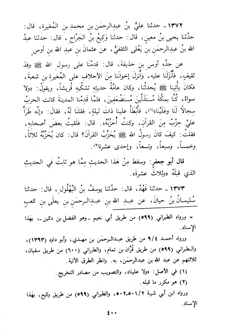 1372 - حَدَّثَنَا عَلِيُّ بْنُ عَبْدِ الرَّحْمَنِ بْنِ مُحَمَّدِ بْنِ الْمُغِيرَةِ، قَالَ: حَدَّثَنَا يَحْيَى بْنُ مَعِينٍ، قَالَ: حَدَّثَنَا وَكِيعُ بْنُ الْجَرَّاحِ، قَالَ: حَدَّثَنَا عَبْدُ اللهِ بْنُ عَبْدِ الرَّحْمَنِ بْنِ يَعْلَى الثَّقَفِيُّ، عَنْ عُثْمَانَ بْنِ عَبْدِ اللهِ بْنِ أَوْسٍ، عَنْ جَدِّهِ أَوْسِ بْنِ حُذَيْفَةَ قَالَ: قَدِمْنَا عَلَى رَسُولِ اللهِ صَلَّى اللَّهُ عَلَيْهِ وَسَلَّمَ وَفْدَ ثَقِيفٍ فَأَنْزَلَنَا عَلَيْهِ , وَأَنْزَلَ إخْوَانَنَا مِنَ الْأَحْلَافِ عَلَى الْمُغِيرَةِ بْنِ شُعْبَةَ، فَكَانَ يَأْتِينَا صَلَّى اللَّهُ عَلَيْهِ وَسَلَّمَ يُحَدِّثُنَا , وَكَانَ عَامَّةُ حَدِيثِهِ تَشَكِّيهِ قُرَيْشًا وَيَقُولُ: " وَلَا سَوَاءٌ، كُنَّا بِمَكَّةَ مُسْتَذَلِّينَ مُسْتَضْعَفِينَ فَلَمَّا قَدِمْنَا الْمَدِينَةَ كَانَتِ الْحَرْبُ سِجَالًا لَنَا وَعَلَيْنَا " فَأَبْطَأَ عَلَيْنَا ذَاتَ لَيْلَةٍ فَقُلْنَا لَهُ، فَقَالَ: " إِنَّهُ طَرَأَ عَلَيَّ حِزْبٌ مِنَ الْقُرْآنِ , وَكُنْتُ أُحَزِّبُهُ " قَالَ: فَلَقِيتُ بَعْضَ أَصْحَابِهِ فَقُلْتُ: كَيْفَ كَانَ رَسُولُ اللهِ صَلَّى اللَّهُ عَلَيْهِ وَسَلَّمَ يُحَزِّبُ الْقُرْآنَ؟ قَالَ كَانَ يُحَزِّبُهُ ثَلَاثًا، وَخَمْسًا، وَسَبْعًا، وَتِسْعًا، وَإِحْدَى عَشْرَةَ قَالَ أَبُو جَعْفَرٍ: وَسَقَطَ مِنْ هَذَا الْحَدِيثِ مِمَّا هُوَ ثَابِتٌ فِي الْحَدِيثِ الَّذِي قَبْلَهُ: " وَثَلَاثَ عَشْرَةَ "