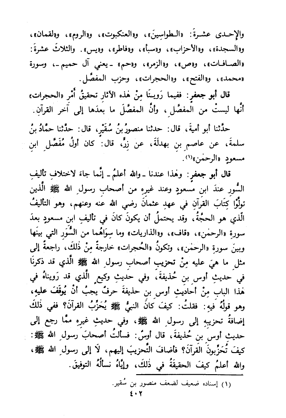 حَدَّثَنَا أَبُو أُمَيَّةَ قَالَ: حَدَّثَنَا مَنْصُورُ بْنُ سُقَيْرٍ، قَالَ: حَدَّثَنَا حَمَّادُ بْنُ سَلَمَةَ عَنْ عَاصِمِ ابْنِ بَهْدَلَةَ عَنْ زِرٍّ قَالَ: " كَانَ أَوَّلُ مُفَصَّلِ ابْنِ مَسْعُودٍ الرَّحْمَنَ " قَالَ أَبُو جَعْفَرٍ: وَهَذَا عِنْدَنَا وَاللهُ أَعْلَمُ إِنَّمَا جَاءَ لِاخْتِلَافِ تَأْلِيفِ السُّوَرِ عِنْدَ ابْنِ مَسْعُودٍ وَعِنْدَ غَيْرِهِ مِنْ أَصْحَابِ رَسُولِ اللهِ صَلَّى اللَّهُ عَلَيْهِ وَسَلَّمَ الَّذِينَ تَوَلَّوْا كِتَابَةَ الْقُرْآنِ فِي عَهْدِ عُثْمَانَ رَضِيَ اللهُ عَنْهُ وَعَنْهُمْ، وَهُوَ التَّأْلِيفُ الَّذِي هُوَ الْحُجَّةُ وَقَدْ يُحْتَمَلُ أَنْ يَكُونَ كَانَ فِي تَأْلِيفِ ابْنِ مَسْعُودٍ بَعْدَ سُورَةِ الرَّحْمَنِ قَاف وَالذَّارِيَاتُ وَمَا سِوَاهُمَا مِنَ السُّوَرِ الَّتِي بَيْنَهَا وَبَيْنَ سُورَةِ الرَّحْمَنِ , وَتَكُونُ الْحُجُرَاتُ خَارِجَةً مِنْ ذَلِكَ رَاجِعَةً إِلَى مِثْلِ مَا هِيَ عَلَيْهِ مِنْ تَحْزِيبِ أَصْحَابِ رَسُولِ اللهِ صَلَّى اللَّهُ عَلَيْهِ وَسَلَّمَ الَّذِي قَدْ ذَكَرْنَا فِي حَدِيثِ أَوْسِ بْنِ حُذَيْفَةَ وَفِي حَدِيثِ وَكِيعٍ الَّذِي قَدْ رَوَيْنَاهُ فِي هَذَا الْبَابِ مِنْ أَحَادِيثِ أَوْسِ بْنِ حُذَيْفَةَ حَرْفٌ يَجِبُ أَنْ يُوقَفَ عَلَيْهِ , وَهُوَ قَوْلُهُ فِيهِ فَقُلْتُ: كَيْفَ كَانَ النَّبِيُّ صَلَّى اللَّهُ عَلَيْهِ وَسَلَّمَ يُحَزِّبُ الْقُرْآنَ؟ فَفِي ذَلِكَ إضَافَةُ تَحْزِيبِهِ إِلَى رَسُولِ اللهِ صَلَّى اللَّهُ عَلَيْهِ وَسَلَّمَ، وَفِي حَدِيثِ غَيْرِهِ مِمَّا رَجَعَ إِلَى حَدِيثِ أَوْسِ بْنِ حُذَيْفَةَ قَالَ أَوْسٌ: فَسَأَلْتُ أَصْحَابَ رَسُولِ اللهِ صَلَّى اللَّهُ عَلَيْهِ وَسَلَّمَ: كَيْفَ تُحَزِّبُونَ الْقُرْآنَ؟ فَأَضَافَ التَّحْزِيبَ إِلَيْهِمْ لَا إِلَى رَسُولِ اللهِ صَلَّى اللَّهُ عَلَيْهِ وَسَلَّمَ، وَاللهُ أَعْلَمُ كَيْفَ الْحَقِيقَةُ فِي ذَلِكَ وَإِيَّاهُ نَسْأَلُهُ التَّوْفِيقَ