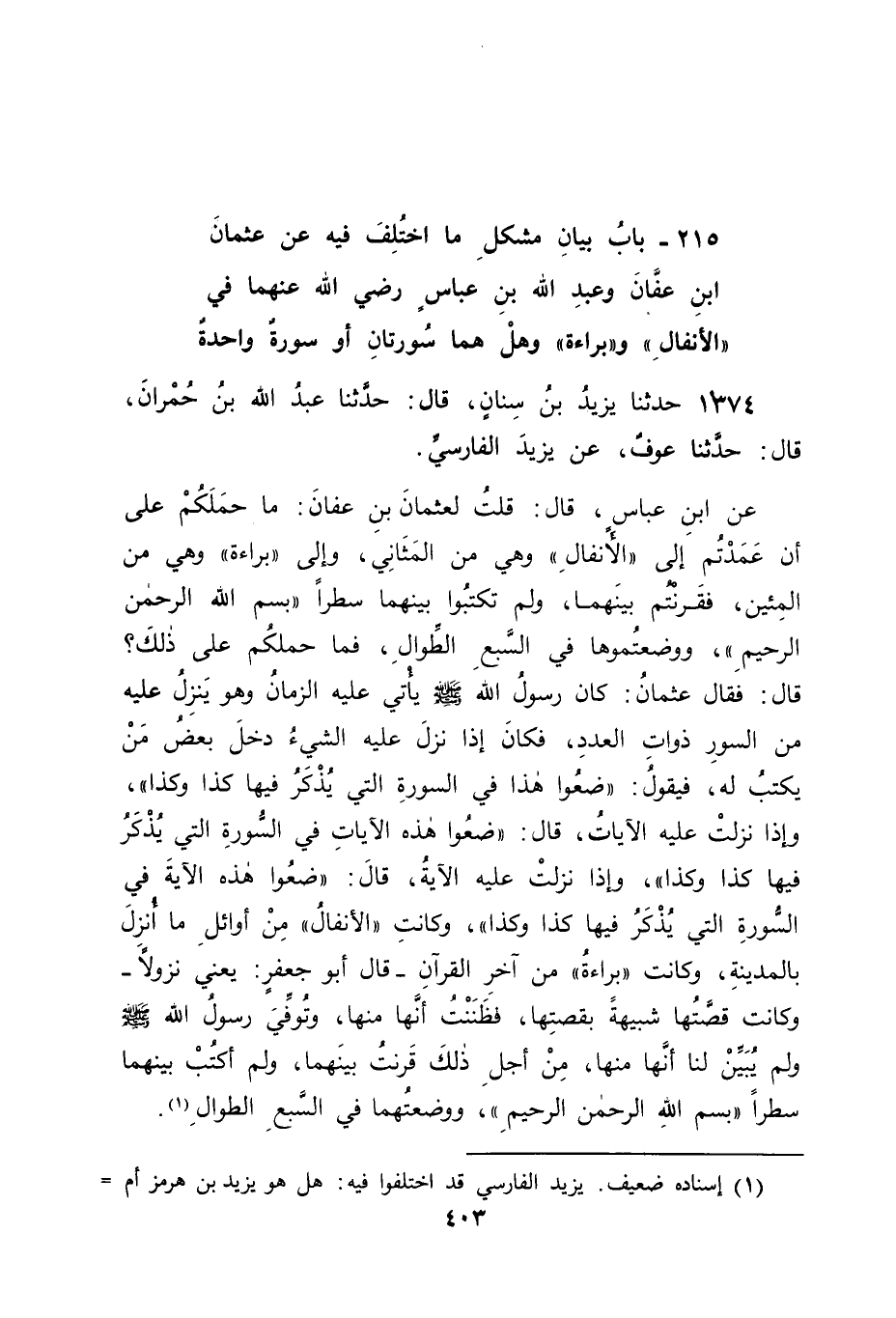 1374 - حَدَّثَنَا يَزِيدُ بْنُ سِنَانٍ، قَالَ: حَدَّثَنَا عَبْدُ اللهِ بْنُ حُمْرَانَ، قَالَ: حَدَّثَنَا عَوْفٌ، عَنْ يَزِيدَ الْفَارِسِيِّ، عَنِ ابْنِ عَبَّاسٍ قَالَ: قُلْتُ لِعُثْمَانَ بْنِ عَفَّانَ مَا حَمَلَكُمْ عَلَى أَنْ عَمَدْتُمْ إِلَى الْأَنْفَالِ وَهِيَ مِنَ الْمَثَانِي وَإِلَى بَرَاءَةَ وَهِيَ مِنَ الْمِئِينَ فَقَرَنْتُمْ بَيْنَهُمَا، وَلَمْ تَكْتُبُوا بَيْنَهُمَا سَطْرًا: بِسْمِ اللهِ الرَّحْمَنِ الرَّحِيمِ، وَوَضَعْتُمُوهَا فِي السَّبْعِ الطِّوَالِ فَمَا حَمَلَكُمْ عَلَى ذَلِكَ؟ قَالَ: فَقَالَ عُثْمَانُ: كَانَ رَسُولُ اللهِ صَلَّى اللَّهُ عَلَيْهِ وَسَلَّمَ يَأْتِي عَلَيْهِ الزَّمَانُ وَهُوَ يَنْزِلُ عَلَيْهِ مِنَ السُّوَرِ ذَوَاتِ الْعَدَدِ فَكَانَ إِذَا نَزَلَ عَلَيْهِ الشَّيْءُ دَخَلَ بَعْضُ مَنْ يَكْتُبُ لَهُ فَيَقُولُ: " ضَعُوا هَذَا فِي السُّورَةِ الَّتِي يُذْكَرُ فِيهَا كَذَا وَكَذَا , " وَإِذَا نَزَلَتْ عَلَيْهِ الْآيَاتُ قَالَ: " ضَعُوا هَذِهِ الْآيَاتِ فِي السُّورَةِ الَّتِي يُذْكَرُ فِيهَا كَذَا وَكَذَا " , وَإِذَا نَزَلَتْ عَلَيْهِ الْآيَةُ , قَالَ: " ضَعُوا هَذِهِ الْآيَةَ فِي السُّورَةِ الَّتِي يُذْكَرُ فِيهَا كَذَا وَكَذَا " وَكَانَتِ الْأَنْفَالُ مِنْ أَوَائِلِ مَا أُنْزِلَ بِالْمَدِينَةِ وَكَانَتْ بَرَاءَةُ مِنْ آخِرِ الْقُرْآنِ " قَالَ أَبُو جَعْفَرٍ: يَعْنِي: نُزُولًا , وَكَانَتْ قِصَّتُهَا شَبِيهَةً بِقِصَّتِهَا , فَظَنَنْتُ أَنَّهَا مِنْهَا، وَتُوُفِّيَ رَسُولُ اللهِ صَلَّى اللَّهُ عَلَيْهِ وَسَلَّمَ وَلَمْ يُبَيِّنْ لَنَا أَنَّهَا مِنْهَا، مِنْ أَجْلِ ذَلِكَ قَرَنْتُ بَيْنَهُمَا وَلَمْ أَكْتُبْ بَيْنَهُمَا سَطْرًا: بِسْمِ اللهِ الرَّحْمَنِ الرَّحِيمِ، وَوَضَعْتُهُمَا فِي السَّبْعِ الطِّوَالِ. -[404]- قَالَ أَبُو جَعْفَرٍ: فَفِي هَذَا الْحَدِيثِ ظَنَّ عُثْمَانُ رَضِيَ اللهُ عَنْهُ أَنَّهُمَا سُورَةٌ وَاحِدَةٌ وَتَحْقِيقُ ابْنِ عَبَّاسٍ أَنَّهُمَا سُورَتَانِ , وَإِذَا كَانَ تَحْزِيبُ الْقُرْآنِ عَلَى مَا فِي حَدِيثِ أَوْسِ بْنِ حُذَيْفَةَ الَّذِي ذَكَرْنَاهُ فِي الْبَابِ الَّذِي قَبْلَ هَذَا الْبَابِ وَجَبَ أَنْ تَكُونَا سُورَتَيْنِ كَمَا قَالَ ابْنُ عَبَّاسٍ وَتَبَايُنُهُمَا فِي الْوَقْتَيْنِ اللَّذَيْنِ كَانَ نُزُولُهُمَا فِيهِمَا يَدُلُّ أَنَّهُمَا سُورَتَانِ لَا سُورَةٌ وَاحِدَةٌ، وَذَلِكَ أَنَّ الْأَنْفَالَ نَزَلَتْ فِي بَدْرٍ