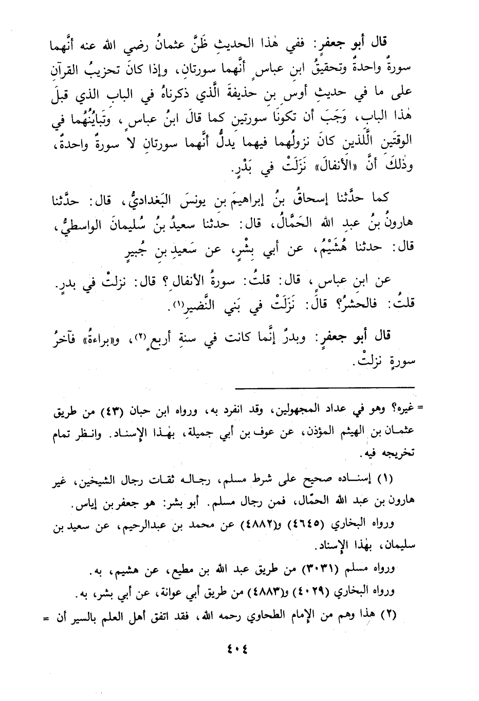 كَمَا حَدَّثَنَا إِسْحَاقُ بْنُ إِبْرَاهِيمَ بْنِ يُونُسَ الْبَغْدَادِيُّ قَالَ: حَدَّثَنَا هَارُونُ بْنُ عَبْدِ اللهِ الْحَمَّالُ، قَالَ: حَدَّثَنَا سَعِيدُ بْنُ سُلَيْمَانَ الْوَاسِطِيُّ قَالَ: حَدَّثَنَا هُشَيْمٌ، عَنْ أَبِي بِشْرٍ عَنْ سَعِيدِ بْنِ جُبَيْرٍ عَنِ ابْنِ عَبَّاسٍ قَالَ: قُلْتُ: سُورَةُ الْأَنْفَالِ؟ . قَالَ: " نَزَلَتْ فِي بَدْرٍ " قُلْتُ: فَالْحَشْرُ. قَالَ " نَزَلَتْ فِي بَنِي النَّضِيرِ " قَالَ أَبُو جَعْفَرٍ: وَبَدْرٌ إِنَّمَا كَانَتْ فِي سَنَةِ أَرْبَعٍ، وَبَرَاءَةُ فَآخِرُ سُورَةٍ نَزَلَتْ