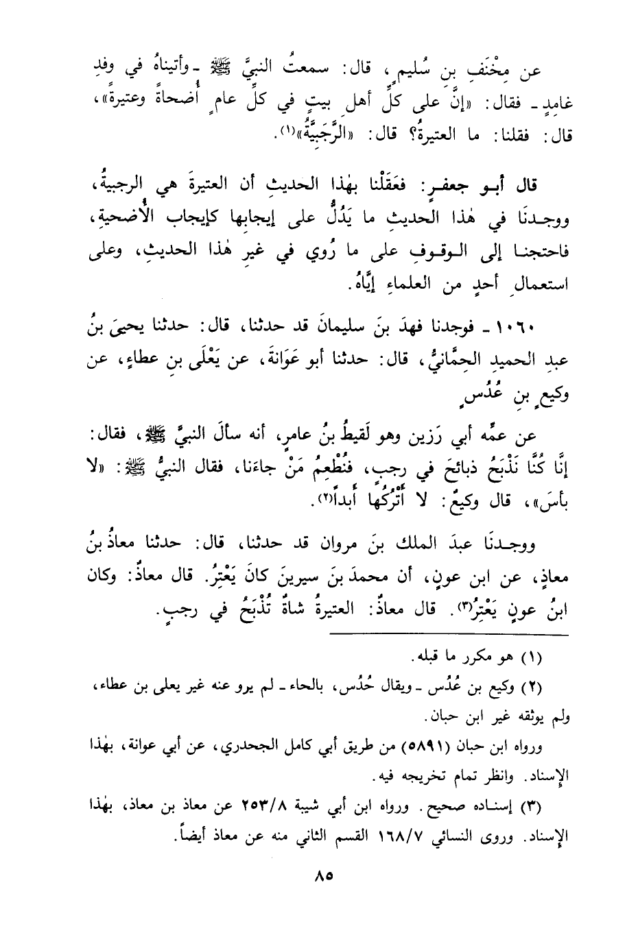 1060 - فَوَجَدْنَا فَهْدَ بْنَ سُلَيْمَانَ قَدْ حَدَّثَنَا قَالَ: حَدَّثَنَا يَحْيَى بْنُ عَبْدِ الْحَمِيدِ الْحِمَّانِيُّ، قَالَ: حَدَّثَنَا أَبُو عَوَانَةَ، عَنْ يَعْلَى بْنِ عَطَاءٍ، عَنْ وَكِيعِ بْنِ عُدُسٍ، عَنْ عَمِّهِ أَبِي رَزِينٍ، وَهُوَ لَقِيطُ بْنُ عَامِرٍ أَنَّهُ سَأَلَ النَّبِيَّ صَلَّى اللَّهُ عَلَيْهِ وَسَلَّمَ فَقَالَ: " إِنَّا كُنَّا نَذْبَحُ ذَبَائِحَ فِي رَجَبٍ فَنُطْعِمُ مَنْ جَاءَنَا، فَقَالَ النَّبِيُّ صَلَّى اللَّهُ عَلَيْهِ وَسَلَّمَ: " لَا بَأْسَ " قَالَ وَكِيعٌ: لَا أَتْرُكُهَا أَبَدًا